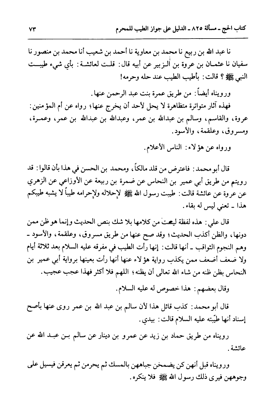 قَالَ أَبُو مُحَمَّدٍ: فَاعْتَرَضَ مَنْ قَلَّدَ مَالِكًا، وَمُحَمَّدَ بْنَ الْحَسَنِ فِي هَذَا بِأَنْ قَالُوا: قَدْ رَوَيْتُمْ مِنْ طَرِيقِ أَبِي عُمَيْرِ بْنِ النَّحَّاسِ عَنْ ضَمْرَةَ بْنِ رَبِيعَةَ عَنْ الْأَوْزَاعِيِّ عَنْ الزُّهْرِيِّ عَنْ عُرْوَةَ عَنْ عَائِشَةَ قَالَتْ: طَيَّبْتُ رَسُولَ اللَّهِ - صَلَّى اللَّهُ عَلَيْهِ وَسَلَّمَ - لِإِحْلَالِهِ وَلِإِحْرَامِهِ طِيبًا لَا يُشْبِهُ طِيبَكُمْ هَذَا - تَعْنِي لَيْسَ لَهُ بَقَاءٌ.
