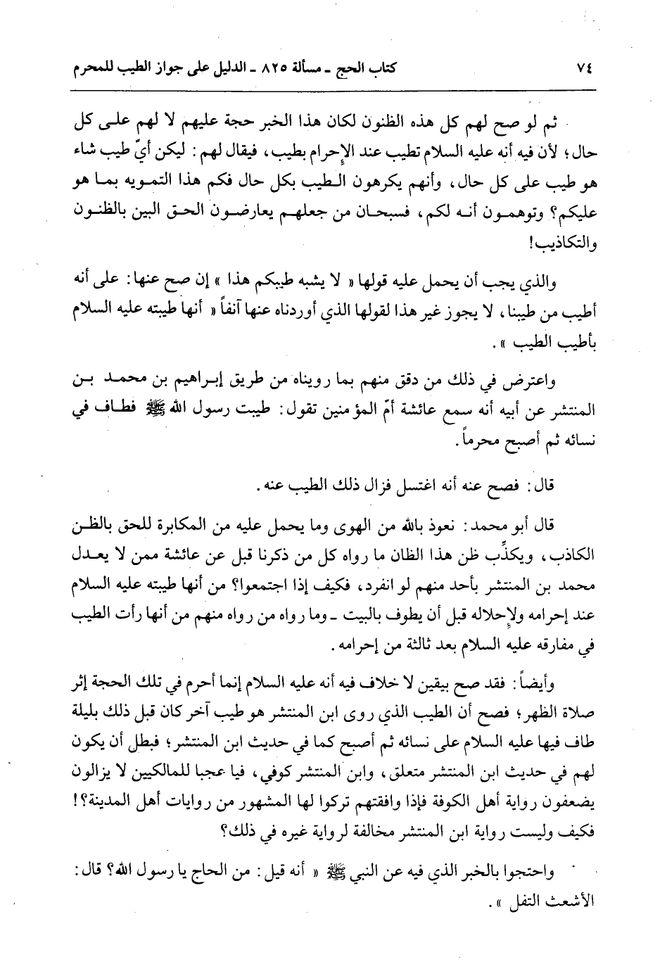 وَأَيْضًا: فَقَدْ صَحَّ بِيَقِينٍ لَا خِلَافَ فِيهِ أَنَّهُ - عَلَيْهِ السَّلَامُ - إنَّمَا أَحْرَمَ فِي تِلْكَ الْحَجَّةِ إثْرَ صَلَاةِ الظُّهْرِ؛ فَصَحَّ أَنَّ الطِّيبَ الَّذِي رَوَى ابْنُ الْمُنْتَشِرِ هُوَ طِيبٌ آخَرُ كَانَ قَبْلَ ذَلِكَ بِلَيْلَةٍ طَافَ فِيهَا - عَلَيْهِ السَّلَامُ - عَلَى نِسَائِهِ ثُمَّ أَصْبَحَ كَمَا فِي حَدِيثِ ابْنِ الْمُنْتَشِرِ؛ فَبَطَلَ أَنْ يَكُونَ لَهُمْ فِي حَدِيثِ ابْنِ الْمُنْتَشِرِ مُتَعَلِّقٌ، وَابْنُ الْمُنْتَشِرِ كُوفِيٌّ، فَيَا عَجَبًا لِلْمَالِكِيِّينَ لَا يَزَالُونَ يُضَعِّفُونَ رِوَايَةَ أَهْلِ الْكُوفَةِ فَإِذَا وَافَقَتْهُمْ تَرَكُوا لَهَا الْمَشْهُورَ مِنْ رِوَايَاتِ أَهْلِ الْمَدِينَةِ؟ فَكَيْفَ وَلَيْسَتْ رِوَايَةُ ابْنِ الْمُنْتَشِرِ مُخَالِفَةً لِرِوَايَةِ غَيْرِهِ فِي ذَلِكَ؟ وَاحْتَجُّوا بِالْخَبَرِ الَّذِي فِيهِ «عَنْ النَّبِيِّ - صَلَّى اللَّهُ عَلَيْهِ وَسَلَّمَ - أَنَّهُ قِيلَ: مَنْ الْحَاجُّ يَا رَسُولَ اللَّهِ؟ قَالَ: الْأَشْعَثُ التَّفِلُ» .