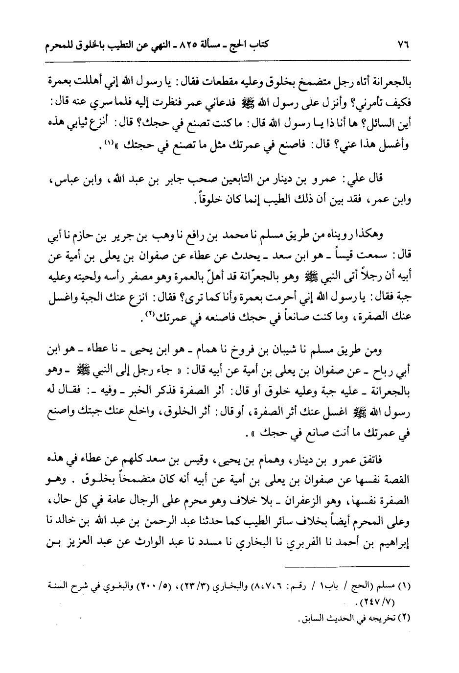 وَمِنْ طَرِيقِ مُسْلِمٍ نَا شَيْبَانُ بْنُ فَرُّوخَ نَا هَمَّامُ هُوَ ابْنُ يَحْيَى - نَا عَطَاءٌ هُوَ ابْنُ أَبِي رَبَاحٍ - عَنْ صَفْوَانَ بْنِ يَعْلَى بْنِ أُمَيَّةَ عَنْ أَبِيهِ قَالَ: «جَاءَ رَجُلٌ إلَى النَّبِيِّ - صَلَّى اللَّهُ عَلَيْهِ وَسَلَّمَ - وَهُوَ بِالْجِعْرَانَةِ - عَلَيْهِ جُبَّةٌ وَعَلَيْهِ خَلُوقٌ أَوْ قَالَ: أَثَرُ الصُّفْرَةِ فَذَكَرَ الْخَبَرَ - وَفِيهِ -: فَقَالَ لَهُ رَسُولُ اللَّهِ - صَلَّى اللَّهُ عَلَيْهِ وَسَلَّمَ - اغْسِلْ عَنْكَ أَثَرَ الصُّفْرَةِ، أَوْ قَالَ: أَثَرَ الْخَلُوقِ، وَاخْلَعْ عَنْكَ جُبَّتَكَ وَاصْنَعْ فِي عُمْرَتِكَ مَا أَنْتَ صَانِعٌ فِي حَجِّكَ» .
