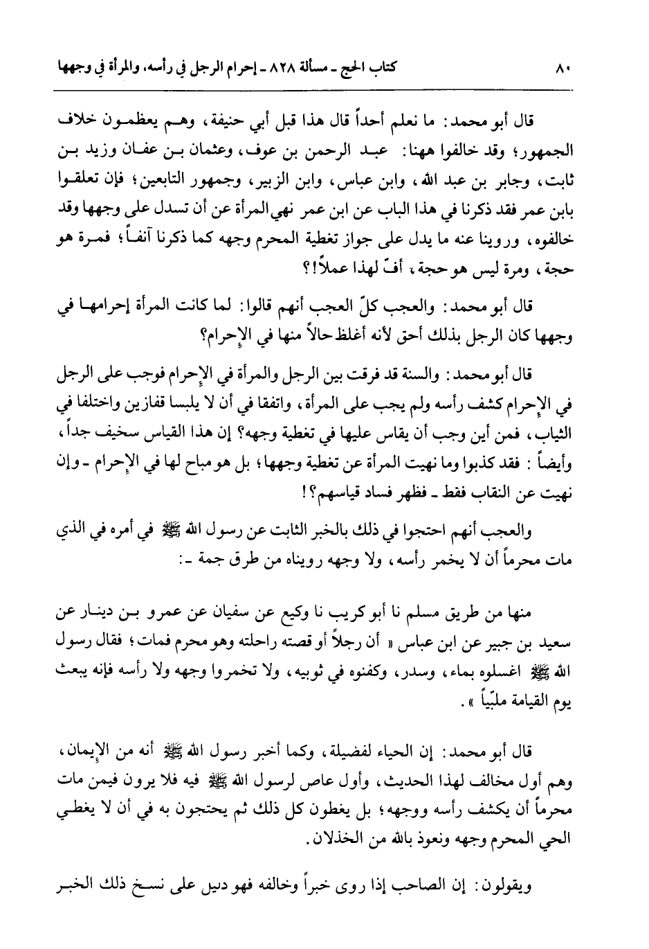 قَالَ أَبُو مُحَمَّدٍ: مَا نَعْلَمُ أَحَدًا قَالَ هَذَا قَبْلَ أَبِي حَنِيفَةَ، وَهُمْ يُعَظِّمُونَ خِلَافَ الْجُمْهُورِ؛ وَقَدْ خَالَفُوا هَاهُنَا: عَبْدَ الرَّحْمَنِ بْنَ عَوْفٍ، وَعُثْمَانَ بْنَ عَفَّانَ وَزَيْدَ بْنَ ثَابِتٍ، وَجَابِرَ بْنَ عَبْدِ اللَّهِ، وَابْنَ عَبَّاسٍ، وَابْنَ الزُّبَيْرِ، وَجُمْهُورَ التَّابِعِينَ؛ فَإِنْ تَعَلَّقُوا بِابْنِ عُمَرَ فَقَدْ ذَكَرْنَا فِي هَذَا الْبَابِ عَنْ ابْنِ عُمَرَ نَهْيَ الْمَرْأَةِ عَنْ أَنْ تَسْدُلَ عَلَى وَجْهِهَا وَقَدْ خَالَفُوهُ، وَرُوِّينَا عَنْهُ مَا يَدُلُّ عَلَى جَوَازِ تَغْطِيَةِ الْمُحْرِمِ وَجْهَهُ كَمَا ذَكَرْنَا آنِفًا؛ فَمَرَّةً هُوَ حُجَّةٌ، وَمَرَّةً لَيْسَ هُوَ حُجَّةً، أُفٍّ لِهَذَا عَمَلًا؟ قَالَ أَبُو مُحَمَّدٍ: وَالْعَجَبُ كُلُّ الْعَجَبِ أَنَّهُمْ قَالُوا: لَمَّا كَانَتْ الْمَرْأَةُ إحْرَامُهَا فِي وَجْهِهَا كَانَ الرَّجُلُ بِذَلِكَ أَحَقُّ لِأَنَّهُ أَغْلَظُ حَالًا مِنْهَا فِي الْإِحْرَامِ؟ قَالَ أَبُو مُحَمَّدٍ: وَالسُّنَّةُ قَدْ فَرَّقَتْ بَيْنَ الرَّجُلِ وَالْمَرْأَةِ فِي الْإِحْرَامِ فَوَجَبَ عَلَى الرَّجُلِ فِي الْإِحْرَامِ كَشْفُ رَأْسِهِ وَلَمْ يَجِبْ عَلَى الْمَرْأَةِ، وَاتَّفَقَا فِي أَنْ لَا يَلْبَسَا قُفَّازَيْنِ وَاخْتَلَفَا فِي الثِّيَابِ، فَمِنْ أَيْنَ وَجَبَ أَنْ يُقَاسَ عَلَيْهَا فِي تَغْطِيَةِ وَجْهِهِ؟ إنَّ هَذَا الْقِيَاسَ سَخِيفٌ جِدًّا، وَأَيْضًا: فَقَدْ كَذَبُوا وَمَا نُهِيَتْ الْمَرْأَةُ عَنْ تَغْطِيَةِ وَجْهِهَا؛ بَلْ هُوَ مُبَاحٌ لَهَا فِي الْإِحْرَامِ - وَإِنْ نُهِيَتْ عَنْ النِّقَابِ فَقَطْ - فَظَهَرَ فَسَادُ قِيَاسِهِمْ؟ وَالْعَجَبُ أَنَّهُمْ احْتَجُّوا فِي ذَلِكَ بِالْخَبَرِ الثَّابِتِ عَنْ رَسُولِ اللَّهِ - صَلَّى اللَّهُ عَلَيْهِ وَسَلَّمَ - فِي أَمْرِهِ فِي الَّذِي مَاتَ مُحْرِمًا أَنْ لَا يُخَمَّرَ رَأْسُهُ، وَلَا وَجْهُهُ رُوِّينَاهُ مِنْ طُرُقٍ جَمَّةٍ -: مِنْهَا مِنْ طَرِيقِ مُسْلِمٍ نَا أَبُو كُرَيْبٍ نَا وَكِيعٌ عَنْ سُفْيَانَ عَنْ عَمْرِو بْنِ دِينَارٍ عَنْ سَعِيدِ بْنِ جُبَيْرٍ عَنْ ابْنِ عَبَّاسٍ «أَنَّ رَجُلًا أَوْقَصَتْهُ رَاحِلَتُهُ وَهُوَ مُحْرِمٌ فَمَاتَ، فَقَالَ رَسُولُ اللَّهِ - صَلَّى اللَّهُ عَلَيْهِ وَسَلَّمَ - اغْسِلُوهُ بِمَاءٍ وَسِدْرٍ، وَكَفِّنُوهُ فِي ثَوْبَيْهِ، وَلَا تُخَمِّرُوا وَجْهَهُ وَلَا رَأْسَهُ فَإِنَّهُ يُبْعَثُ يَوْمَ الْقِيَامَةِ مُلَبِّيًا» .