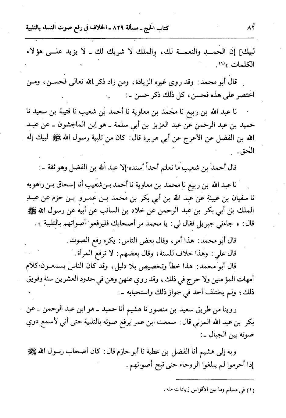قَالَ أَبُو مُحَمَّدٍ: هَذَا خَطَأٌ وَتَخْصِيصٌ بِلَا دَلِيلٍ، وَقَدْ كَانَ النَّاسُ يَسْمَعُونَ كَلَامَ أُمَّهَاتِ الْمُؤْمِنِينَ وَلَا حَرَجَ فِي ذَلِكَ، وَقَدْ رُوِيَ عَنْهُنَّ وَهُنَّ فِي حُدُودِ الْعِشْرِينَ سَنَةً وَفُوَيْقَ ذَلِكَ؛ وَلَمْ يَخْتَلِفْ أَحَدٌ فِي جَوَازِ ذَلِكَ وَاسْتِحْبَابِهِ -: رُوِّينَا مِنْ طَرِيقِ سَعِيدِ بْنِ مَنْصُورٍ نَا هُشَيْمٌ أَنَا حُمَيْدٍ هُوَ ابْنُ عَبْدِ الرَّحْمَنِ - عَنْ بَكْرِ بْنِ عَبْدِ اللَّهِ الْمُزَنِيّ قَالَ: سَمِعْت ابْنَ عُمَرَ يَرْفَعُ صَوْتَهُ بِالتَّلْبِيَةِ حَتَّى أَنِّي لَأَسْمَعُ دَوِيَّ صَوْتِهِ بَيْنَ الْجِبَالِ -: وَبِهِ إلَى هُشَيْمٍ أَنَا الْفَضْلُ بْنُ عَطِيَّةَ نَا أَبُو حَازِمٍ قَالَ: كَانَ أَصْحَابُ رَسُولِ اللَّهِ - صَلَّى اللَّهُ عَلَيْهِ وَسَلَّمَ - إذَا أَحْرَمُوا لَمْ يَبْلُغُوا الرَّوْحَاءَ حَتَّى تُبَحَّ أَصْوَاتُهُمْ.