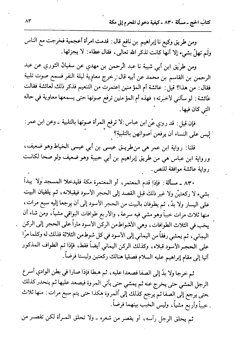 وَمِنْ طَرِيقِ ابْنِ أَبِي شَيْبَةَ نَا عَبْدُ الرَّحْمَنِ بْنُ مَهْدِيٍّ عَنْ سُفْيَانَ الثَّوْرِيِّ عَنْ عَبْدِ الرَّحْمَنِ بْنِ الْقَاسِمِ بْنِ مُحَمَّدٍ عَنْ أَبِيهِ قَالَ: خَرَجَ مُعَاوِيَةُ لَيْلَةَ النَّفَرِ فَسَمِعَ صَوْتَ تَلْبِيَةٍ فَقَالَ: مَنْ هَذَا؟ قِيلَ: عَائِشَةَ أُمَّ الْمُؤْمِنِينَ اعْتَمَرَتْ مِنْ التَّنْعِيمِ فَذُكِرَ ذَلِكَ لِعَائِشَةَ فَقَالَتْ عَائِشَةُ: لَوْ سَأَلَنِي لَأَخْبَرْته؛ فَهَذِهِ أُمُّ الْمُؤْمِنِينَ تَرْفَعُ صَوْتَهَا حَتَّى يَسْمَعَهَا مُعَاوِيَةُ فِي حَالِهِ الَّتِي كَانَ فِيهَا.