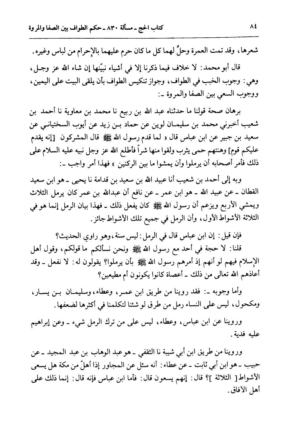قَالَ أَبُو مُحَمَّدٍ: لَا خِلَافَ فِيمَا ذَكَرْنَا إلَّا فِي أَشْيَاءَ نُبَيِّنُهَا إنْ شَاءَ اللَّهُ عَزَّ وَجَلَّ، وَهِيَ: وُجُوبُ الْخَبَبِ فِي الطَّوَافِ، وَجَوَازُ تَنْكِيسِ الطَّوَافِ بِأَنْ يَلْقَى الْبَيْتَ عَلَى الْيَمِينِ، وَوُجُوبُ السَّعْيِ بَيْنَ الصَّفَا وَالْمَرْوَةِ -: بُرْهَانُ صِحَّةِ قَوْلِنَا مَا حَدَّثَنَاهُ عَبْدُ اللَّهِ بْنُ رَبِيعٍ نَا مُحَمَّدُ بْنُ مُعَاوِيَةَ نَا أَحْمَدُ بْنُ شُعَيْبٍ أَخْبَرَنِي مُحَمَّدُ بْنُ سُلَيْمَانَ لُوَيْنٍ عَنْ حَمَّادِ بْنِ زَيْدٍ عَنْ أَيُّوبَ السِّخْتِيَانِيُّ عَنْ سَعِيدِ بْنِ جُبَيْرٍ عَنْ ابْنِ عَبَّاسٍ قَالَ «لَمَّا قَدِمَ رَسُولُ اللَّهِ - صَلَّى اللَّهُ عَلَيْهِ وَسَلَّمَ - قَالَ الْمُشْرِكُونَ إنَّهُ يَقْدَمُ عَلَيْكُمْ قَوْمٌ وَهَنَتْهُمْ حُمَّى يَثْرِبَ وَلَقُوا مِنْهَا شَرًّا فَأَطْلَعَ اللَّهُ - عَزَّ وَجَلَّ نَبِيَّهُ - عَلَيْهِ السَّلَامُ - عَلَى ذَلِكَ فَأَمَرَ أَصْحَابَهُ أَنْ يَرْمُلُوا وَأَنْ يَمْشُوا مَا بَيْنَ الرُّكْنَيْنِ» فَهَذَا أَمْرٌ وَاجِبٌ -: وَبِهِ إلَى أَحْمَدَ بْنِ شُعَيْبٍ أَنَا عُبَيْدُ اللَّهِ بْنُ سَعِيدِ بْنِ قُدَامَةَ نَا يَحْيَى هُوَ ابْنُ سَعِيدٍ الْقَطَّانُ - عَنْ عُبَيْدِ اللَّهِ هُوَ ابْنُ عُمَرَ - عَنْ نَافِعٍ أَنَّ عَبْدَ اللَّهِ بْنَ عُمَرَ كَانَ يَرْمُلُ الثَّلَاثَ وَيَمْشِي الْأَرْبَعَ وَيَزْعُمُ أَنَّ رَسُولَ اللَّهِ - صَلَّى اللَّهُ عَلَيْهِ وَسَلَّمَ - كَانَ يَفْعَلُ ذَلِكَ - فَهَذَا بَيَانُ الرَّمَلِ إنَّمَا هُوَ فِي الثَّلَاثَةِ الْأَشْوَاطِ الْأُوَلِ، وَأَنَّ الرَّمَلَ فِي جَمِيعِ تِلْكَ الْأَشْوَاطِ جَائِزٌ.