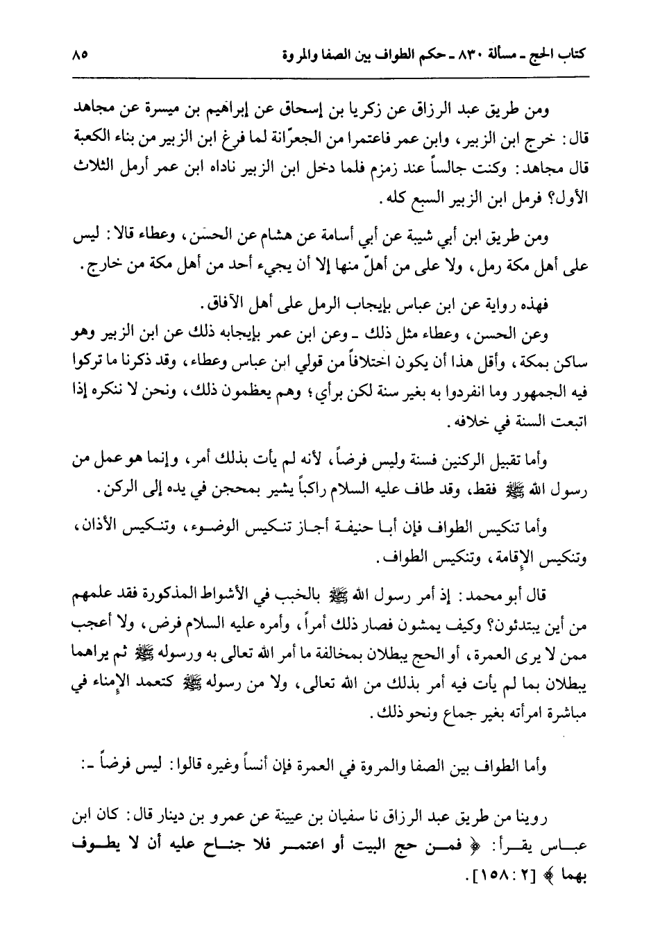 وَأَمَّا الطَّوَافُ بَيْنَ الصَّفَا وَالْمَرْوَةِ فِي الْعُمْرَةِ فَإِنَّ أَنَسًا وَغَيْرَهُ قَالُوا: لَيْسَ فَرْضًا -: رُوِّينَا مِنْ طَرِيقِ عَبْدِ الرَّزَّاقِ نَا سُفْيَانُ بْنُ عُيَيْنَةَ عَنْ عَمْرِو بْنِ دِينَارٍ قَالَ: كَانَ ابْنُ عَبَّاسٍ يَقْرَأُ: " فَمَنْ حَجَّ الْبَيْتَ أَوْ اعْتَمَرَ فَلَا جُنَاحَ عَلَيْهِ أَنْ لَا يَطَّوَّفَ بِهِمَا.