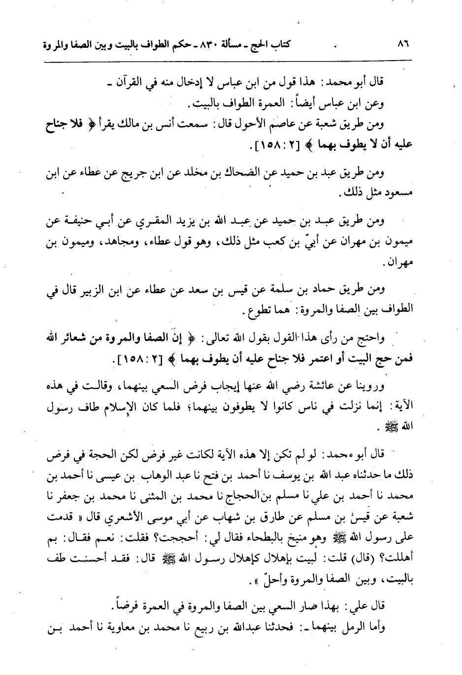 قَالَ أَبُو مُحَمَّدٍ: لَوْ لَمْ تَكُنْ إلَّا هَذِهِ الْآيَةُ لَكَانَتْ غَيْرَ فَرْضٍ لَكِنَّ الْحُجَّةَ فِي فَرْضِ ذَلِكَ مَا حَدَّثَنَاهُ عَبْدُ اللَّهِ بْنُ يُوسُفَ نَا أَحْمَدُ بْنُ فَتْحٍ نَا عَبْدُ الْوَهَّابِ بْنُ عِيسَى نَا أَحْمَدُ بْنُ مُحَمَّدٍ نَا أَحْمَدُ بْنُ عَلِيٍّ نَا مُسْلِمُ بْنُ الْحَجَّاجِ نَا مُحَمَّدُ بْنُ الْمُثَنَّى نَا مُحَمَّدُ بْنُ جَعْفَرٍ نَا شُعْبَةُ عَنْ قَيْسِ بْنِ مُسْلِمٍ عَنْ طَارِقِ بْنِ شِهَابٍ عَنْ أَبِي مُوسَى الْأَشْعَرِيِّ قَالَ «قَدِمْتُ عَلَى رَسُولِ اللَّهِ - صَلَّى اللَّهُ عَلَيْهِ وَسَلَّمَ - وَهُوَ مُنِيخٌ بِالْبَطْحَاءِ فَقَالَ لِي: أَحَجَجْتَ؟ فَقُلْتُ: نَعَمْ فَقَالَ: بِمَ أَهْلَلْتَ؟ قَالَ قُلْتُ: لَبَّيْتُ بِإِهْلَالٍ كَإِهْلَالِ رَسُولِ اللَّهِ - صَلَّى اللَّهُ عَلَيْهِ وَسَلَّمَ - قَالَ: فَقَدْ أَحْسَنْتَ طُفْ بِالْبَيْتِ، وَبَيْنَ الصَّفَا وَالْمَرْوَةِ وَأَحِلَّ» .