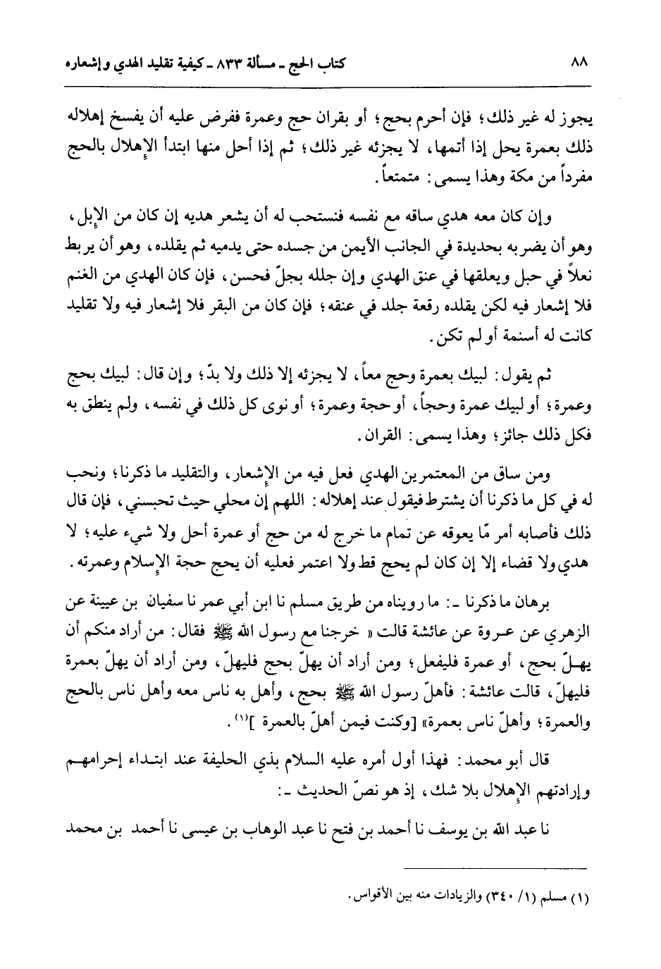 بُرْهَانُ مَا ذَكَرْنَا -: مَا رُوِّينَاهُ مِنْ طَرِيقِ مُسْلِمٍ نَا ابْنُ أَبِي عُمَرَ نَا سُفْيَانُ بْنُ عُيَيْنَةَ عَنْ الزُّهْرِيِّ عَنْ عُرْوَةَ عَنْ عَائِشَةَ قَالَتْ «خَرَجْنَا مَعَ رَسُولِ اللَّهِ - صَلَّى اللَّهُ عَلَيْهِ وَسَلَّمَ - فَقَالَ: مَنْ أَرَادَ مِنْكُمْ أَنْ يُهِلَّ بِحَجٍّ، أَوْ عُمْرَةٍ فَلْيَفْعَلْ، وَمَنْ أَرَادَ أَنْ يُهِلَّ بِحَجٍّ فَلْيُهِلَّ، وَمَنْ أَرَادَ أَنْ يُهِلَّ بِعُمْرَةٍ فَلْيُهِلَّ، قَالَتْ عَائِشَةُ: فَأَهَلَّ رَسُولُ اللَّهِ - صَلَّى اللَّهُ عَلَيْهِ وَسَلَّمَ - بِحَجٍّ، وَأَهَلَّ بِهِ نَاسٌ مَعَهُ وَأَهَلَّ نَاسٌ بِالْحَجِّ وَالْعُمْرَةِ؛ وَأَهَلَّ نَاسٌ بِعُمْرَةٍ وَكُنْتُ فِيمَنْ أَهَلَّ بِالْعُمْرَةِ» .