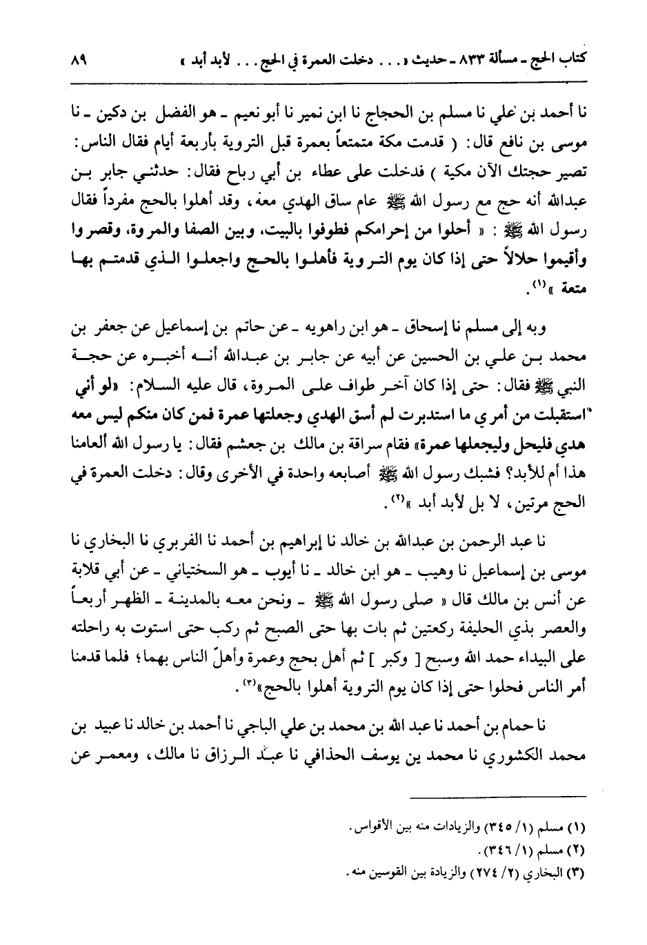 وَبِهِ إلَى مُسْلِمٍ نَا إِسْحَاقُ هُوَ ابْنُ رَاهْوَيْهِ - عَنْ حَاتِمِ بْنِ إسْمَاعِيلَ عَنْ جَعْفَرِ بْنِ مُحَمَّدِ بْنِ عَلِيِّ بْنِ الْحُسَيْنِ عَنْ أَبِيهِ عَنْ جَابِرِ بْنِ عَبْدِ اللَّهِ أَنَّهُ أَخْبَرَهُ عَنْ حَجَّةِ النَّبِيِّ - صَلَّى اللَّهُ عَلَيْهِ وَسَلَّمَ - فَقَالَ: «حَتَّى إذَا كَانَ آخِرَ طَوَافٍ عَلَى الْمَرْوَةِ، قَالَ - عَلَيْهِ السَّلَامُ -: لَوْ أَنِّي اسْتَقْبَلْتُ مِنْ أَمْرِي مَا اسْتَدْبَرْتُ لَمْ أَسُقْ الْهَدْيَ وَجَعَلْتُهَا عُمْرَةً فَمَنْ كَانَ مِنْكُمْ لَيْسَ مَعَهُ هَدْيٌ فَلْيَحِلَّ وَلْيَجْعَلْهَا عُمْرَةً فَقَامَ سُرَاقَةُ بْنُ مَالِكِ بْنِ جُعْشُمٍ فَقَالَ: يَا رَسُولَ اللَّهِ أَلِعَامِنَا هَذَا أَمْ لِلْأَبَدِ؟ فَشَبَّكَ رَسُولُ اللَّهِ - صَلَّى اللَّهُ عَلَيْهِ وَسَلَّمَ - أَصَابِعَهُ وَاحِدَةً فِي الْأُخْرَى وَقَالَ: دَخَلَتْ الْعُمْرَةُ فِي الْحَجِّ مَرَّتَيْنِ، لَا بَلْ لِأَبَدٍ أَبَدٍ» . نَا عَبْدُ الرَّحْمَنِ بْنُ عَبْدِ اللَّهِ بْنِ خَالِدٍ نَا إبْرَاهِيمُ بْنُ أَحْمَدَ نَا الْفَرَبْرِيُّ نَا الْبُخَارِيُّ نَا مُوسَى بْنُ إسْمَاعِيلَ نَا وُهَيْبٍ هُوَ ابْنُ خَالِدٍ - نَا أَيُّوبُ هُوَ السِّخْتِيَانِيُّ - عَنْ أَبِي قِلَابَةَ عَنْ أَنَسِ بْنِ مَالِكٍ قَالَ «صَلَّى رَسُولُ اللَّهِ - صَلَّى اللَّهُ عَلَيْهِ وَسَلَّمَ - وَنَحْنُ مَعَهُ بِالْمَدِينَةِ - الظُّهْرَ أَرْبَعًا وَالْعَصْرَ بِذِي الْحُلَيْفَةِ رَكْعَتَيْنِ ثُمَّ بَاتَ بِهَا حَتَّى الصُّبْحِ ثُمَّ رَكِبَ حَتَّى اسْتَوَتْ بِهِ رَاحِلَتُهُ عَلَى الْبَيْدَاءِ حَمِدَ اللَّهَ وَسَبَّحَ وَكَبَّرَ ثُمَّ أَهَلَّ بِحَجٍّ وَعُمْرَةٍ وَأَهَلَّ النَّاسُ بِهِمَا، فَلَمَّا قَدِمْنَا أَمَرَ النَّاسَ فَحَلُّوا حَتَّى إذَا كَانَ يَوْمُ التَّرْوِيَةِ أَهَلُّوا بِالْحَجِّ» .