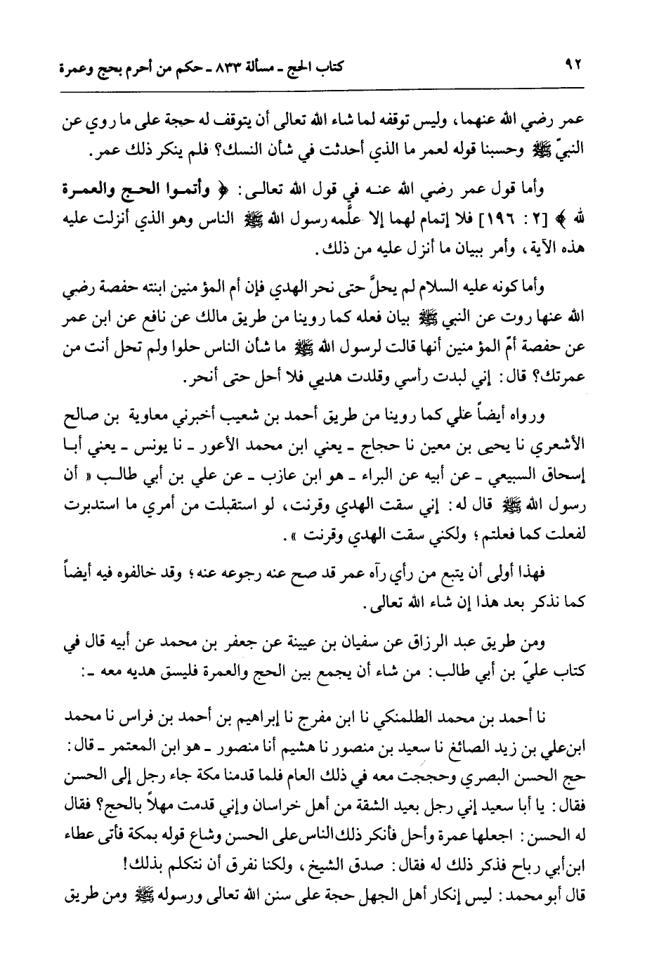 عُمَرَ - رَضِيَ اللَّهُ عَنْهُمَا -، وَلَيْسَ تَوَقُّفُهُ لِمَا شَاءَ اللَّهُ تَعَالَى أَنْ يَتَوَقَّفَ لَهُ حُجَّةٌ عَلَى مَا رُوِيَ عَنْ النَّبِيِّ - صَلَّى اللَّهُ عَلَيْهِ وَسَلَّمَ - وَحَسْبُنَا قَوْلُهُ لِعُمَرَ مَا الَّذِي أَحْدَثْتَ فِي شَأْنِ النُّسُكِ؟ فَلَمْ يُنْكِرْ ذَلِكَ عُمَرُ.