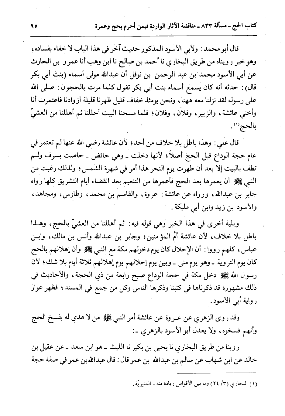 وَقَدْ رَوَى الزُّهْرِيُّ عَنْ عُرْوَةَ عَنْ عَائِشَةَ «أَمْرَ النَّبِيِّ - صَلَّى اللَّهُ عَلَيْهِ وَسَلَّمَ - مَنْ لَا هَدْيَ لَهُ بِفَسْخِ الْحَجِّ» وَأَنَّهُمْ فَسَخُوهُ، وَلَا يُعْدَلُ أَبُو الْأَسْوَدِ بِالزُّهْرِيِّ -: رُوِّينَا مِنْ طَرِيقِ الْبُخَارِيِّ نَا يَحْيَى بْنُ بُكَيْرٍ نَا اللَّيْثُ هُوَ ابْنُ سَعْدٍ - عَنْ عُقَيْلِ بْنِ خَالِدٍ عَنْ ابْنِ شِهَابٍ عَنْ سَالِمِ بْنِ عَبْدِ اللَّهِ بْنِ عُمَرَ قَالَ: قَالَ عَبْدُ اللَّهِ بْنُ عُمَرَ فِي صِفَةِ حَجَّةِ