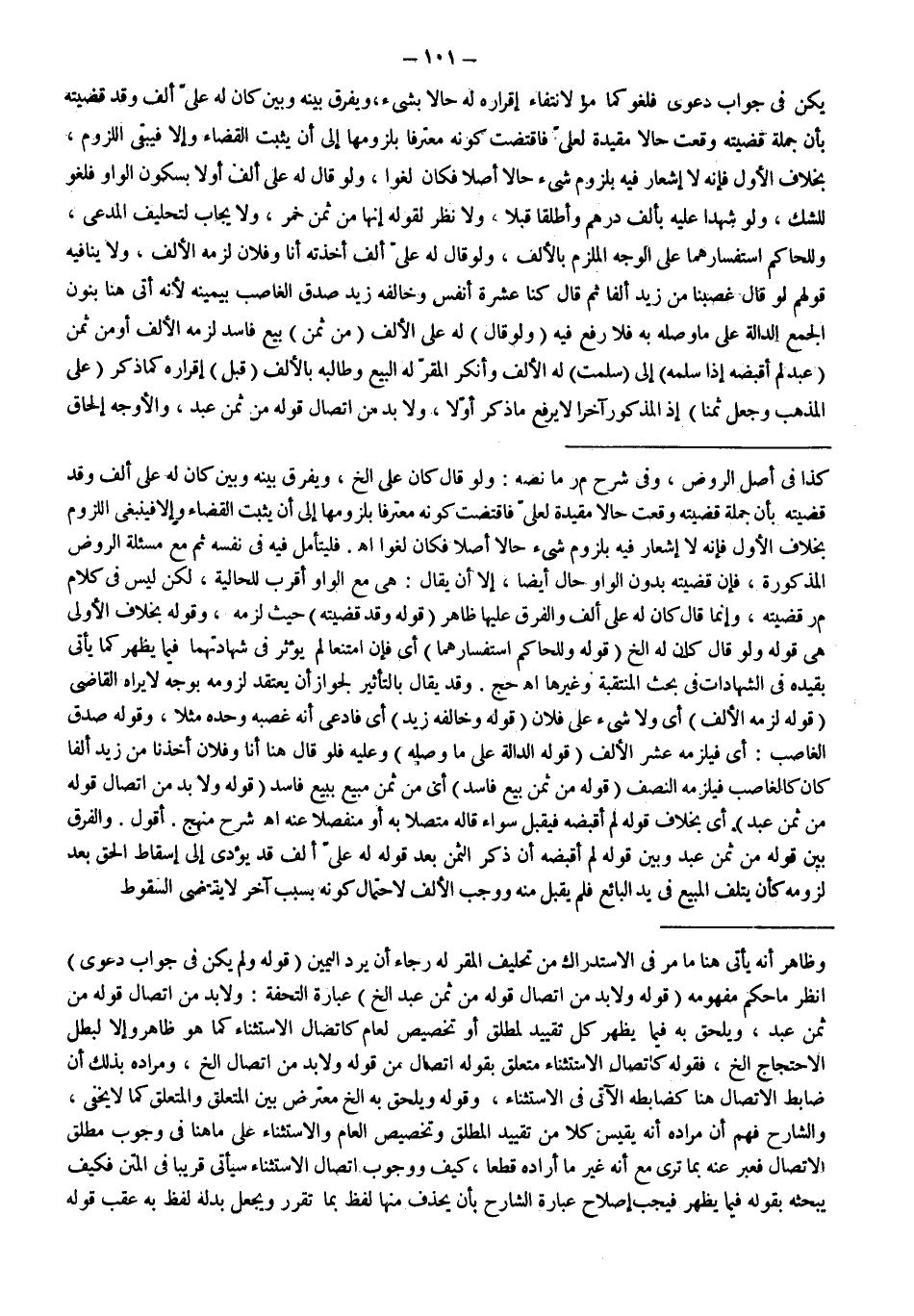 ـــــــــــــــــــــــــــــQوَظَاهِرٌ أَنَّهُ يَأْتِي هُنَا مَا مَرَّ فِي الِاسْتِدْرَاكِ مِنْ تَحْلِيفِ الْمُقَرِّ لَهُ رَجَاءَ أَنْ يَرُدَّ الْيَمِينَ. (قَوْلُهُ: وَلَمْ يَكُنْ فِي جَوَابِ دَعْوَى) اُنْظُرْ مَا حُكْمُ مَفْهُومِهِ (قَوْلُهُ: وَلَا بُدَّ مِنْ اتِّصَالِ قَوْلِهِ مِنْ ثَمَنِ عَبْدٍ إلَخْ) عِبَارَةُ التُّحْفَةِ: وَلَا بُدَّ مِنْ اتِّصَالِ قَوْلِهِ مِنْ ثَمَنِ عَبْدٍ، وَيَلْحَقُ بِهِ فِيمَا يَظْهَرُ كُلُّ تَقْيِيدٍ لِمُطْلَقٍ أَوْ تَخْصِيصٍ لِعَامٍّ كَاتِّصَالِ الِاسْتِثْنَاءِ كَمَا هُوَ ظَاهِرٌ وَإِلَّا لَبَطَلَ الِاحْتِجَاجُ إلَخْ، فَقَوْلُهُ: كَاتِّصَالِ الِاسْتِثْنَاءِ مُتَعَلِّقٌ بِقَوْلِهِ اتِّصَالِ مِنْ قَوْلِهِ وَلَا بُدَّ مِنْ اتِّصَالِ إلَخْ، وَمُرَادُهُ بِذَلِكَ أَنَّ ضَابِطَ الِاتِّصَالِ هُنَا كَضَابِطِهِ الْآتِي فِي الِاسْتِثْنَاءِ، وَقَوْلُهُ: وَيَلْحَقُ بِهِ إلَخْ مُعْتَرِضٌ بَيْنَ الْمُتَعَلِّقِ وَالْمُتَعَلَّقِ كَمَا لَا يَخْفَى، وَالشَّارِحُ فَهِمَ أَنَّ مُرَادَهُ أَنَّهُ يَقِيسُ كُلًّا مِنْ تَقْيِيدِ الْمُطْلَقِ، وَتَخْصِيصِ الْعَامِّ، وَالِاسْتِثْنَاءُ عَلَى مَا هُنَا فِي وُجُوبِ مُطْلَقِ الِاتِّصَالِ فَعَبَّرَ عَنْهُ بِمَا تَرَى مَعَ أَنَّهُ غَيْرُ مَا أَرَادَهُ قَطْعًا، كَيْفَ وَوُجُوبُ اتِّصَالِ الِاسْتِثْنَاءِ سَيَأْتِي قَرِيبًا فِي الْمَتْنِ فَكَيْفَ يَبْحَثُهُ بِقَوْلِهِ فِيمَا يَظْهَرُ فَيَجِبُ إصْلَاحُ عِبَارَةِ الشَّارِحِ بِأَنْ يَحْذِفَ مِنْهَا لَفْظَ بِمَا تَقَرَّرَ وَيَجْعَلَ بَدَلَهُ لَفْظَ بِهِ عَقِبَ قَوْلِهِ