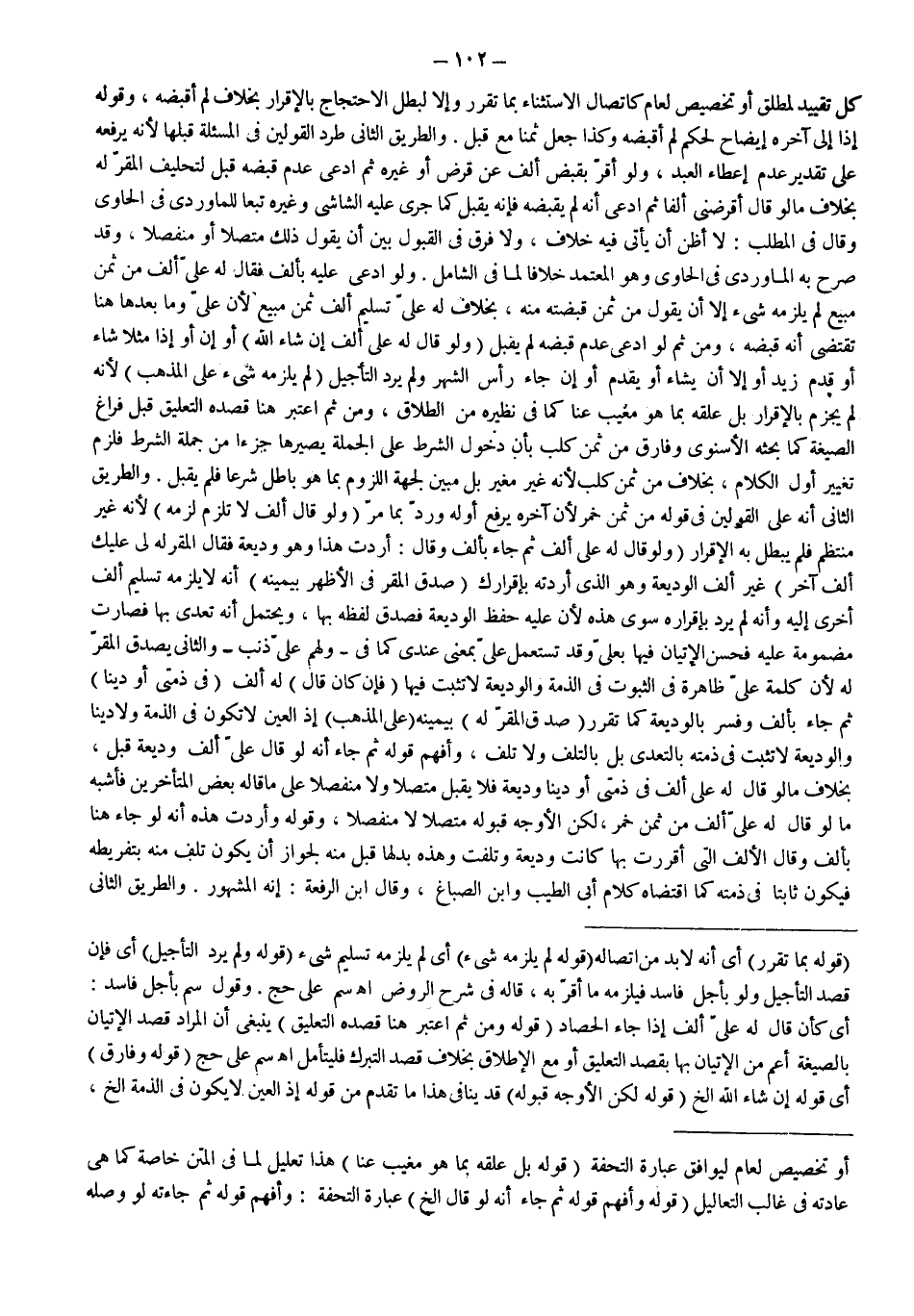 كُلِّ تَقْيِيدٍ لِمُطْلَقٍ أَوْ تَخْصِيصٍ لِعَامٍّ كَاتِّصَالِ الِاسْتِثْنَاءِ بِمَا تَقَرَّرَ وَإِلَّا لَبَطَلَ الِاحْتِجَاجُ بِالْإِقْرَارِ بِخِلَافِ لَمْ أَقْبِضْهُ، وَقَوْلُهُ: إذَا إلَى آخِرِهِ إيضَاحٌ لِحُكْمٍ لَمْ أَقْبِضْهُ وَكَذَا جُعِلَ ثَمَنًا مَعَ قُبِلَ.