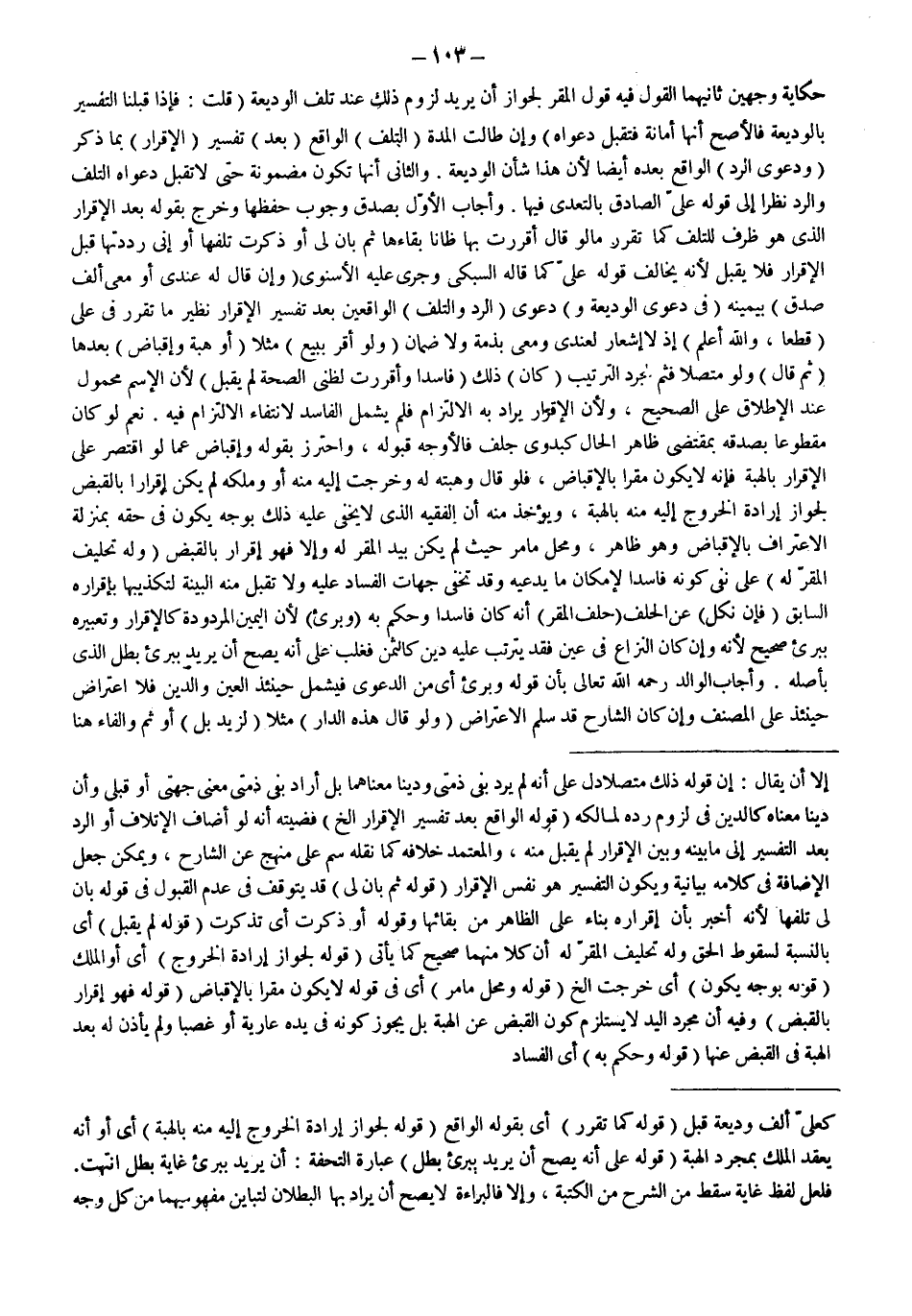ـــــــــــــــــــــــــــــSإلَّا أَنْ يُقَالَ: إنَّ قَوْلَهُ ذَلِكَ مُتَّصِلًا دَلَّ عَلَى أَنَّهُ لَمْ يُرِدْ بِفِي ذِمَّتِي وَدَيْنًا مَعْنَاهُمَا بَلْ أَرَادَ بِفِي ذِمَّتِي مَعْنَى جِهَتِي أَوْ قِبَلِي وَأَنَّ دَيْنًا مَعْنَاهُ كَالدَّيْنِ فِي لُزُومِ رَدِّهِ لِمَالِكِهِ (قَوْلُهُ: الْوَاقِعَيْنِ بَعْدَ تَفْسِيرِ الْإِقْرَارِ إلَخْ) قَضِيَّتُهُ أَنَّهُ لَوْ أَضَافَ الْإِتْلَافَ أَوْ الرَّدَّ بَعْدَ التَّفْسِيرِ إلَى مَا بَيْنَهُ وَبَيْنَ الْإِقْرَارِ لَمْ يُقْبَلْ مِنْهُ، وَالْمُعْتَمَدُ خِلَافُهُ كَمَا نَقَلَهُ سم عَلَى مَنْهَجِ عَنْ الشَّارِحِ، وَيُمْكِنُ جَعْلُ الْإِضَافَةِ فِي كَلَامِهِ بَيَانِيَّةً وَيَكُونُ التَّفْسِيرُ هُوَ نَفْسَ الْإِقْرَارِ (قَوْلُهُ: ثُمَّ بَانَ لِي) قَدْ يَتَوَقَّفُ فِي عَدَمِ الْقَبُولُ فِي قَوْلِهِ بَانَ لِي تَلَفُهَا لِأَنَّهُ أَخْبَرَ بِأَنَّ إقْرَارَهُ بِنَاءً عَلَى الظَّاهِرِ مِنْ بَقَائِهَا وَقَوْلُهُ أَوْ ذَكَرْت أَيْ تَذَكَّرْت. (قَوْلَهُ لَمْ يُقْبَلْ) أَيْ بِالنِّسْبَةِ لِسُقُوطِ الْحَقِّ وَلَهُ تَحْلِيفُ الْمُقَرِّ لَهُ أَنَّ كُلًّا مِنْهُمَا صَحِيحٌ كَمَا يَأْتِي (قَوْلُهُ: لِجَوَازِ إرَادَةِ الْخُرُوجِ) أَيْ أَوْ الْمِلْكِ (قَوْلُهُ بِوَجْهٍ يَكُونُ) أَيْ خَرَجَتْ إلَخْ (قَوْلُهُ: وَمَحَلُّ مَا مَرَّ) أَيْ فِي قَوْلِهِ لَا يَكُونُ مُقِرًّا بِالْإِقْبَاضِ (قَوْلُهُ: فَهُوَ إقْرَارٌ بِالْقَبْضِ) وَفِيهِ أَنَّ مُجَرَّدَ الْيَدِ لَا يَسْتَلْزِمُ كَوْنَ الْقَبْضِ عَنْ الْهِبَةِ بَلْ يَجُوزُ كَوْنُهُ فِي يَدِهِ عَارِيَّةً أَوْ غَصْبًا وَلَمْ يَأْذَنْ لَهُ بَعْدَ الْهِبَةِ فِي الْقَبْضِ عَنْهَا (قَوْلُهُ: وَحُكِمَ بِهِ) أَيْ الْفَسَادِ.