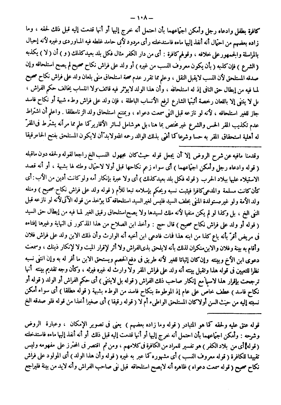 ـــــــــــــــــــــــــــــQقَوْلِهِ عَتَقَ عَلَيْهِ وَلَحِقَهُ كَمَا هُوَ الْمُتَبَادَرُ. (قَوْلُهُ: وَمَا زَادَهُ بَعْضُهُمْ) يَعْنِي فِي تَصْوِيرِ الْإِمْكَانِ، وَعِبَارَةُ الرَّوْضِ وَشَرْحُهُ: وَأَمْكَنَ اجْتِمَاعُهُمَا بِأَنْ احْتَمَلَ أَنَّهُ خَرَجَ إلَيْهَا أَوْ أَنَّهَا قَدِمَتْ إلَيْهِ قَبْلَ ذَلِكَ أَوْ أَنَّهُ أَنْفَذَ إلَيْهَا مَاءَهُ فَاسْتَدْخَلَتْهُ (قَوْلُهُ: أَيْ مِنْ بِلَادِ الْكُفْرِ) هُوَ تَفْسِيرٌ لِلْمُرَادِ مِنْ الْكَافِرَةِ فِي كَلَامِهِمْ، وَمِنْ ثَمَّ اقْتَصَرَ فِي الْمُحْتَرَزِ عَلَى مَفْهُومِهِ وَلَيْسَ تَقْيِيدًا لِلْكَافِرَةِ. (قَوْلُهُ: مَعْرُوفَ النَّسَبِ) أَيْ مَشْهُورَهُ كَمَا عَبَّرَ بِهِ غَيْرُهُ. (قَوْلُهُ: وَأَنَّ هَذَا الْوَلَدَ) أَيْ: الْمَوْلُودَ عَلَى فِرَاشِ نِكَاحٍ صَحِيحٍ (قَوْلُهُ: سُمِعَتْ دَعْوَاهُ) ظَاهِرُهُ أَنَّهُ لَا يَصِحُّ اسْتِلْحَاقُهُ قَبْلَ نَفْيِ صَاحِبِ الْفِرَاشِ وَأَنَّهُ لَا بُدَّ مِنْ بَيِّنَةٍ فَلْيُرَاجَعْ