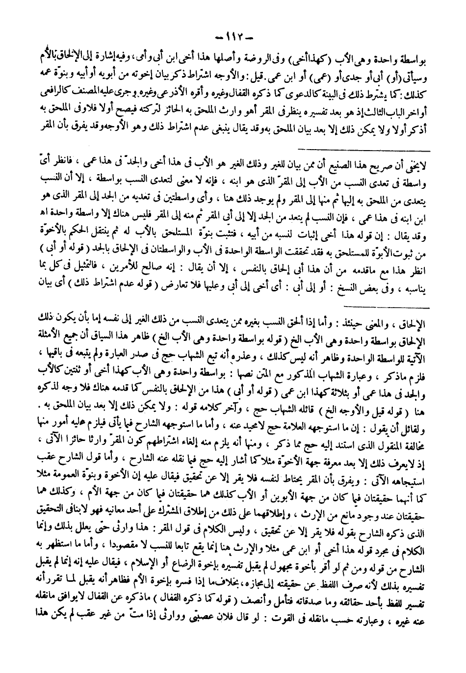 ـــــــــــــــــــــــــــــQالْإِلْحَاقِ، وَالْمَعْنَى حِينَئِذٍ: وَأَمَّا إذَا أَلْحَقَ النَّسَبَ بِغَيْرِهِ مِمَّنْ يَتَعَدَّى النَّسَبُ مِنْ ذَلِكَ الْغَيْرِ إلَى نَفْسِهِ إمَّا بِأَنْ يَكُونَ ذَلِكَ الْإِلْحَاقُ بِوَاسِطَةٍ وَاحِدَةٍ وَهِيَ الْأَبُ إلَخْ (قَوْلُهُ: بِوَاسِطَةٍ وَاحِدَةٍ وَهِيَ الْأَبُ إلَخْ) ظَاهِرُ هَذَا السِّيَاقِ أَنَّ جَمِيعَ الْأَمْثِلَةِ الْآتِيَةِ لِلْوَاسِطَةِ الْوَاحِدَةِ وَظَاهِرٌ أَنَّهُ لَيْسَ كَذَلِكَ، وَعُذْرُهُ أَنَّهُ تَبِعَ الشِّهَابَ حَجّ فِي صَدْرِ الْعِبَارَةِ وَلَمْ يَتْبَعْهُ فِي بَاقِيهَا؛ فَلَزِمَ مَا ذُكِرَ، وَعِبَارَةُ الشِّهَابِ الْمَذْكُورِ مَعَ الْمَتْنِ نَصُّهَا: بِوَاسِطَةٍ وَاحِدَةٍ وَهِيَ الْأَبُ كَهَذَا أَخِي أَوْ ثِنْتَيْنِ كَالْأَبِ وَالْجَدِّ فِي هَذَا عَمِّي أَوْ بِثَلَاثَةٍ كَهَذَا ابْنِ عَمِّي (قَوْلُهُ: أَوْ أَبِي) هَذَا مِنْ الْإِلْحَاقِ بِالنَّفْسِ كَمَا قَدَّمَهُ هُنَاكَ فَلَا وَجْهَ لِذِكْرِهِ هُنَا. (قَوْلُهُ: قِيلَ وَالْأَوْجَهُ إلَخْ) قَائِلُهُ الشِّهَابُ حَجّ، وَآخِرُ كَلَامِهِ قَوْلُهُ: وَلَا يُمْكِنُ ذَلِكَ إلَّا بَعْدَ بَيَانِ الْمُلْحَقِ بِهِ.