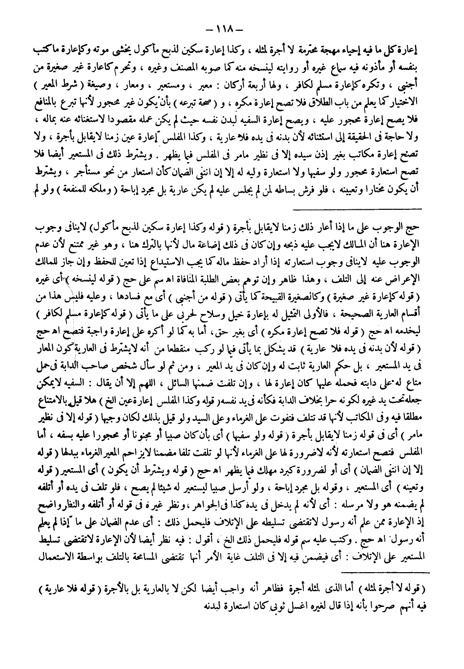 إعَارَةِ كُلِّ مَا فِيهِ إحْيَاءُ مُهْجَةٍ مُحْتَرَمَةٍ لَا أُجْرَةَ لِمِثْلِهِ، وَكَذَا إعَارَةُ سِكِّينٍ لِذَبْحِ مَأْكُولٍ يُخْشَى مَوْتُهُ وَكَإِعَارَةِ مَا كَتَبَ بِنَفْسِهِ أَوْ مَأْذُونِهِ فِيهِ سَمَاعُ غَيْرِهِ أَوْ رِوَايَتُهُ لِيَنْسَخَهُ مِنْهُ كَمَا صَوَّبَهُ الْمُصَنِّفُ وَغَيْرُهُ، وَتَحْرُمُ كَإِعَارَةِ غَيْرِ صَغِيرَةٍ مِنْ أَجْنَبِيٍّ، وَتُكْرَهُ كَإِعَارَةِ مُسْلِمٍ لِكَافِرِ، وَلَهَا أَرْبَعَةُ أَرْكَانٍ: مُعِيرٌ، وَمُسْتَعِيرٌ، وَمُعَارٌ، وَصِيغَةٌ.