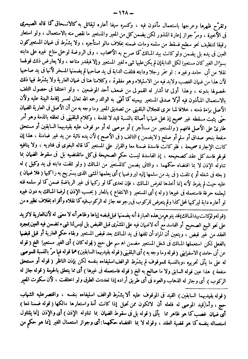 ـــــــــــــــــــــــــــــQقَوْلُهُ: بِقَيْدَيْهِمَا السَّابِقَيْنِ) الْقَيْدُ فِي الْمَوْقُوفِ عَلَيْهِ أَلَّا يَشْتَرِطَ الْوَاقِفُ اسْتِيفَاءَهُ بِنَفْسِهِ، وَاقْتَصَرَ عَلَيْهِ الشِّهَابُ حَجّ، وَأَمَّا قَيْدُ الْمُوصَى لَهُ فَلَعَلَّهُ أَنْ لَا تَكُونَ مِمَّنْ تَحْبَلُ إذَا كَانَتْ أَمَةً وَاسْتَعَارَهَا مَالِكُهَا. (قَوْلُهُ: ضَمِنَا مَعًا) أَيْ ضَمَانَ غَصْبٍ كَمَا هُوَ ظَاهِرٌ مِمَّا يَأْتِي (قَوْلُهُ: بَلْ فِي سُقُوطِ الضَّمَانِ بِمَا تَنَاوَلَهُ الْإِذْنُ) أَيْ: وَالْإِذْنُ إنَّمَا يَتَنَاوَلُ اسْتِعْمَالَهُ بِنَفْسِهِ كَمَا هُوَ قَضِيَّةُ الْعَقْدِ، وَقَوْلُهُ: لَا بِمَا اقْتَضَاهُ حُكْمُهُمَا: أَيْ: وَجَوَازُ اسْتِعْمَالِ الْغَيْرِ إنَّمَا هُوَ حُكْمٌ مِنْ