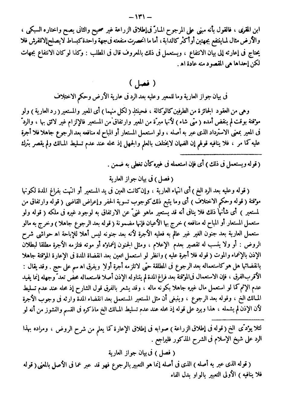 (فَصْلٌ) فِي بَيَانِ جَوَازِ الْعَارِيَّةِ وَمَا لِلْمُعِيرِ وَعَلَيْهِ بَعْدَ الرَّدِّ فِي عَارِيَّةِ الْأَرْضِ وَحُكْمِ الِاخْتِلَافِ وَهِيَ مِنْ الْعُقُودِ الْجَائِزَةِ مِنْ الطَّرَفَيْنِ كَالْوَكَالَةِ، فَحِينَئِذٍ (لِكُلٍّ مِنْهُمَا) أَيْ الْمُعِيرِ وَالْمُسْتَعِيرِ (رَدُّ الْعَارِيَّةِ) وَلَوْ مُؤَقَّتَةً بِوَقْتٍ لَمْ يَنْقَضِ أَمَدُهُ (مَتَى شَاءَ) لِأَنَّهَا مَبَرَّةٌ مِنْ الْمُعِيرِ وَارْتِفَاقٌ مِنْ الْمُسْتَعِيرِ فَالْإِلْزَامُ غَيْرُ لَائِقٍ بِهَا، وَالرَّدُّ فِي الْمُعِيرِ بِمَعْنَى الِاسْتِرْدَادِ الَّذِي عَبَّرَ بِهِ أَصْلُهُ، وَلَوْ اسْتَعْمَلَ الْمُسْتَعَارَ أَوْ الْمُبَاحَ لَهُ مَنَافِعُهُ بَعْدَ الرُّجُوعِ جَاهِلًا فَلَا أُجْرَةَ عَلَيْهِ كَمَا مَرَّ، فَلَا يُنَافِيهِ قَوْلُهُمْ إنَّ الضَّمَانَ لَا يَخْتَلِفُ بِالْعِلْمِ وَالْجَهْلِ إذْ مَحَلُّهُ عِنْدَ عَدَمِ تَسْلِيطِ الْمَالِكِ وَلَمْ يُقَصِّرْ بِتَرْكِ