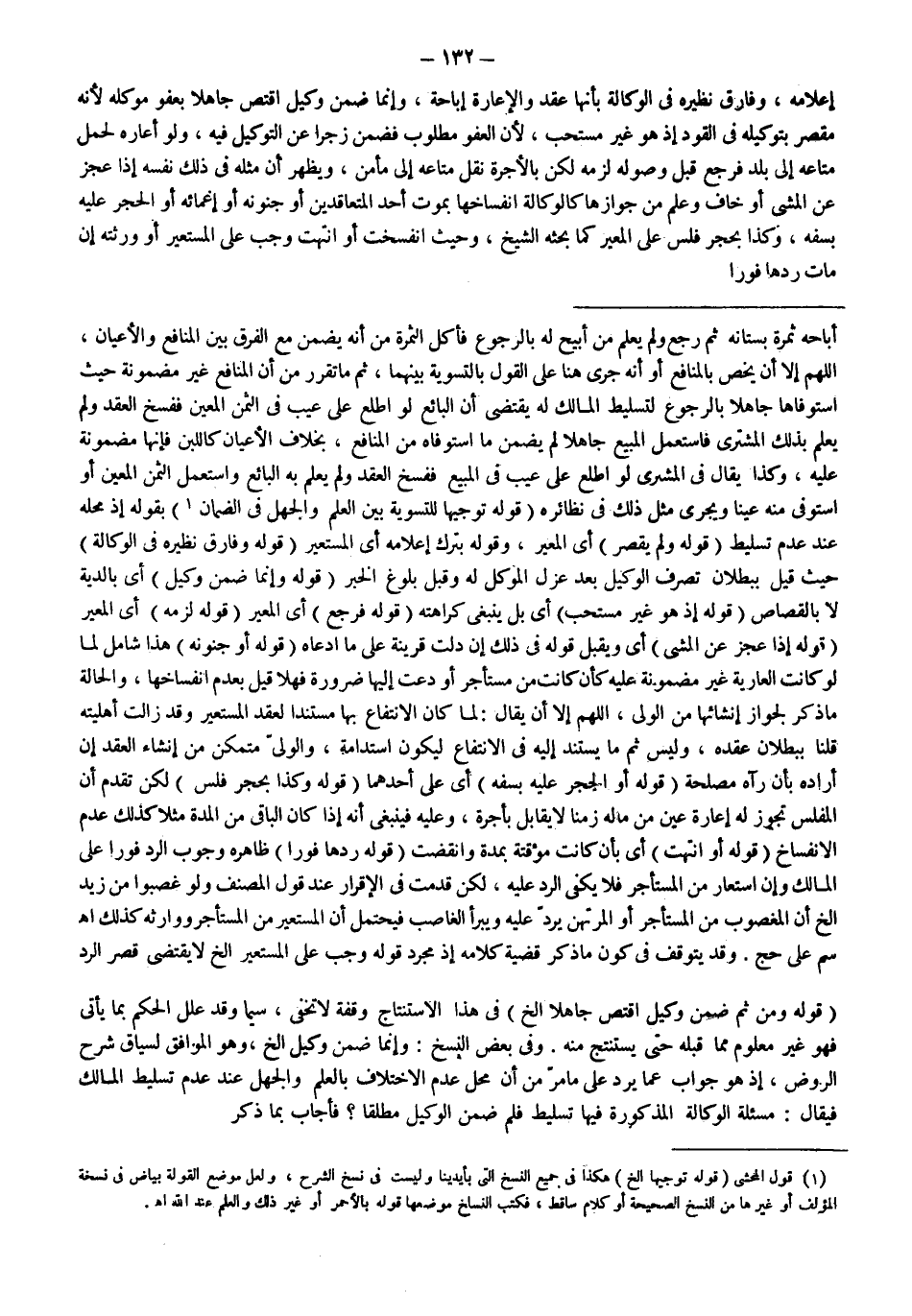 إعْلَامِهِ، وَفَارَقَ نَظِيرَهُ فِي الْوَكَالَةِ بِأَنَّهَا عَقْدٌ وَالْإِعَارَةُ إبَاحَةٌ، وَإِنَّمَا ضَمِنَ وَكِيلٌ اقْتَصَّ جَاهِلًا بِعَفْوِ مُوَكِّلِهِ لِأَنَّهُ مُقَصِّرٌ بِتَوْكِيلِهِ فِي الْقَوَدِ إذْ هُوَ غَيْرُ مُسْتَحَبٍّ، لِأَنَّ الْعَفْوَ مَطْلُوبٌ فَضَمِنَ زَجْرًا عَنْ التَّوْكِيلِ فِيهِ، وَلَوْ أَعَارَهُ لِحَمْلِ مَتَاعِهِ إلَى بَلَدٍ فَرَجَعَ قَبْلَ وُصُولِهِ لَزِمَهُ لَكِنْ بِالْأُجْرَةِ نَقْلُ مَتَاعِهِ إلَى مَأْمَنٍ، وَيَظْهَرُ أَنَّ مِثْلَهُ فِي ذَلِكَ نَفْسِهِ إذَا عَجَزَ عَنْ الْمَشْيِ أَوْ خَافَ وَعَلِمَ مِنْ جَوَازِهَا كَالْوَكَالَةِ انْفِسَاخَهَا بِمَوْتِ أَحَدِ الْمُتَعَاقِدَيْنِ أَوْ جُنُونِهِ أَوْ إغْمَائِهِ أَوْ الْحَجْرِ عَلَيْهِ بِسَفَهٍ، وَكَذَا بِحَجْرِ فَلَسٍ عَلَى الْمُعِيرِ كَمَا بَحَثَهُ الشَّيْخُ، وَحَيْثُ انْفَسَخَتْ أَوْ انْتَهَتْ وَجَبَ عَلَى الْمُسْتَعِيرِ أَوْ وَرَثَتِهِ إنْ مَاتَ رَدُّهَا فَوْرًا
