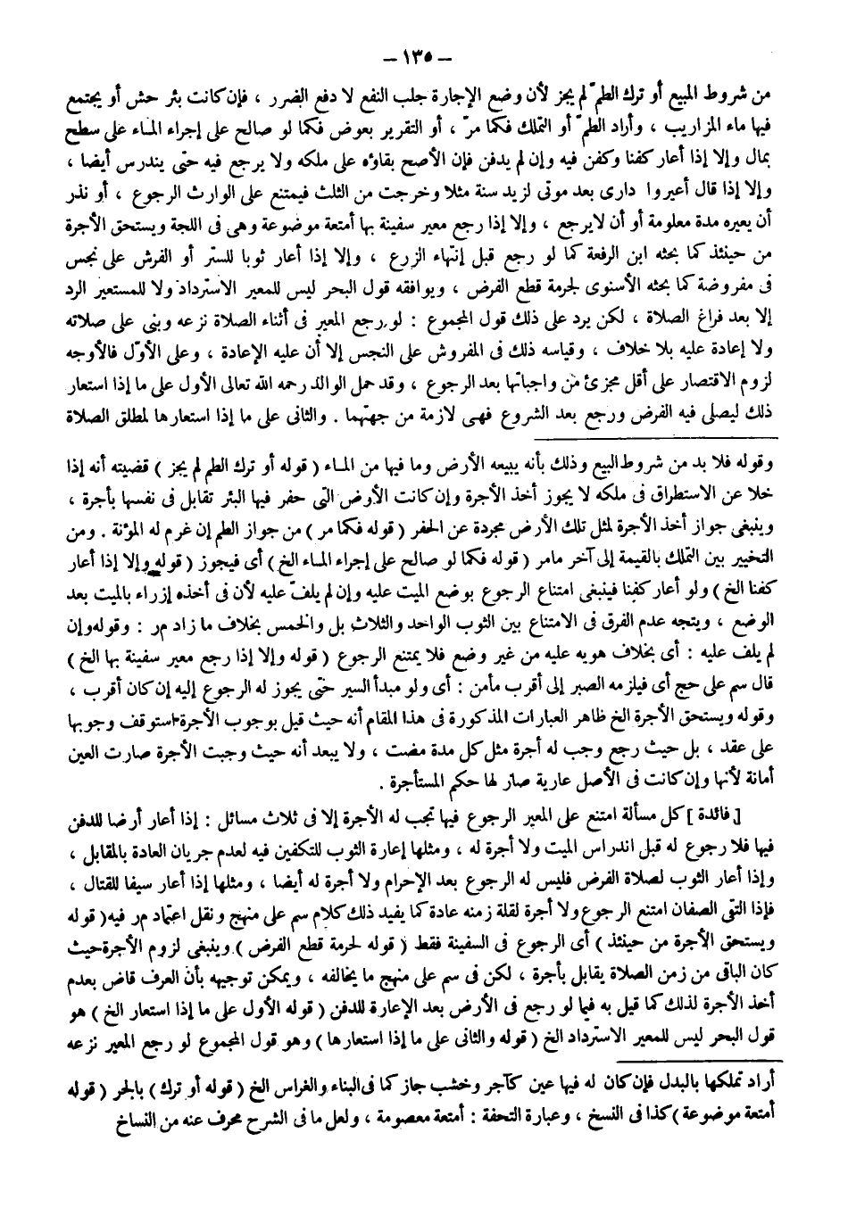 ـــــــــــــــــــــــــــــSوَقَوْلُهُ فَلَا بُدَّ مِنْ شُرُوطِ الْبَيْعِ وَذَلِكَ بِأَنَّهُ يَبِيعُهُ الْأَرْضَ وَمَا فِيهَا مِنْ الْمَاءِ (قَوْلُهُ: أَوْ تَرَكَ الطَّمَّ لَمْ يَجُزْ) قَضِيَّتُهُ أَنَّهُ إذَا خَلَا عَنْ الِاسْتِطْرَاقِ فِي مِلْكِهِ لَا يَجُوزُ أَخْذُ الْأُجْرَةِ وَإِنْ كَانَتْ الْأَرْضُ الَّتِي حَفَرَ فِيهَا الْبِئْرَ تُقَابَلُ فِي نَفْسِهَا بِأُجْرَةٍ، وَيَنْبَغِي جَوَازُ أَخْذِ الْأُجْرَةِ لِمِثْلِ تِلْكَ الْأَرْضِ مُجَرَّدَةً عَنْ الْحَفْرِ (قَوْلُهُ: فَكَمَا مَرَّ) مِنْ جَوَازِ الطَّمِّ إنْ غَرِمَ لَهُ الْمُؤْنَةَ. وَمِنْ التَّخْيِيرِ بَيْنَ التَّمَلُّكِ بِالْقِيمَةِ إلَى آخِرِ مَا مَرَّ (قَوْلُهُ: فَكَمَا لَوْ صَالَحَ عَلَى إجْرَاءِ الْمَاءِ إلَخْ) أَيْ فَيَجُوزُ (قَوْلُهُ: وَإِلَّا إذَا أَعَارَ كَفَنًا إلَخْ) وَلَوْ أَعَارَ كَفَنًا فَيَنْبَغِي امْتِنَاعُ الرُّجُوعِ بِوَضْعِ الْمَيِّتِ عَلَيْهِ وَإِنْ لَمْ يُلَفَّ عَلَيْهِ لِأَنَّ فِي أَخْذِهِ إزْرَاءً بِالْمَيِّتِ بَعْدَ الْوَضْعِ، وَيَتَّجِهُ عَدَمُ الْفَرْقِ فِي الِامْتِنَاعِ بَيْنَ الثَّوْبِ الْوَاحِدِ وَالثَّلَاثِ بَلْ وَالْخَمْسِ بِخِلَافِ مَا زَادَ م ر: وَقَوْلُهُ وَإِنْ لَمْ يُلَفَّ عَلَيْهِ: أَيْ بِخِلَافِ هَوِيِّهِ عَلَيْهِ مِنْ غَيْرِ وَضْعٍ فَلَا يَمْتَنِعُ الرُّجُوعُ (قَوْلُهُ: وَإِلَّا إذَا رَجَعَ مُعِيرُ سَفِينَةٍ بِهَا إلَخْ) قَالَ سم عَلَى حَجّ أَيْ فَيَلْزَمُهُ الصَّبْرُ إلَى أَقْرَبِ مَأْمَنٍ: أَيْ وَلَوْ مَبْدَأَ السَّيْرِ حَتَّى يَجُوزَ لَهُ الرُّجُوعُ إلَيْهِ إنْ كَانَ أَقْرَبَ، وَقَوْلُهُ وَيَسْتَحِقُّ الْأُجْرَةَ إلَخْ ظَاهِرُ الْعِبَارَاتِ الْمَذْكُورَةِ فِي هَذَا الْمَقَامِ أَنَّهُ حَيْثُ قِيلَ بِوُجُوبِ الْأُجْرَةِ اسْتَوْقَفَ وُجُوبُهَا عَلَى عَقْدٍ، بَلْ حَيْثُ رَجَعَ وَجَبَ لَهُ أُجْرَةٌ مِثْلُ كُلِّ مُدَّةٍ مَضَتْ، وَلَا يَبْعُدُ أَنَّهُ حَيْثُ وَجَبَتْ الْأُجْرَةُ صَارَتْ الْعَيْنُ أَمَانَةً لِأَنَّهَا وَإِنْ كَانَتْ فِي الْأَصْلِ عَارِيَّةً صَارَ لَهَا حُكْمُ الْمُسْتَأْجَرَةِ.
