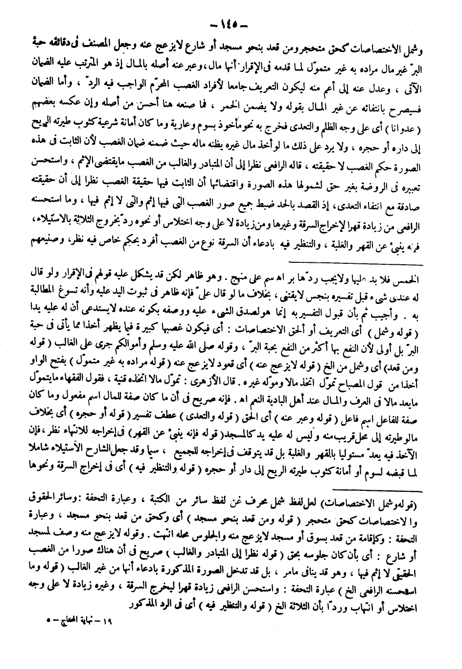 ـــــــــــــــــــــــــــــSالْخَمْسُ فَلَا بُدَّ عَلَيْهَا وَلَا يَجِبُ رَدُّهَا بِرّ اهـ سم عَلَى مَنْهَجٍ. وَهُوَ ظَاهِرٌ لَكِنْ قَدْ يُشْكِلُ عَلَيْهِ قَوْلُهُمْ فِي الْإِقْرَارِ وَلَوْ قَالَ لَهُ عِنْدِي شَيْءٌ قَبْلَ تَفْسِيرِهِ بِنَجِسٍ لَا يُقْتَنَى، بِخِلَافِ مَا لَوْ قَالَ عَلَيَّ فَإِنَّهُ ظَاهِرٌ فِي ثُبُوتِ الْيَدِ عَلَيْهِ وَأَنَّهُ تَسُوغُ الْمُطَالَبَةُ بِهِ. وَأُجِيبَ ثَمَّ بِأَنَّ قَبُولَ التَّفْسِيرِ بِهِ إنَّمَا هُوَ لِصِدْقِ الشَّيْءِ عَلَيْهِ وَوَصْفُهُ بِكَوْنِهِ عِنْدَهُ لَا يَسْتَدْعِي أَنَّ لَهُ عَلَيْهِ يَدًا (قَوْلُهُ: وَشَمِلَ) أَيْ التَّعْرِيفُ أَوْ أُلْحِقَ الِاخْتِصَاصَاتُ: أَيْ فَيَكُونُ غَصْبُهَا كَبِيرَةً فِيمَا يَظْهَرُ أَخْذًا مِمَّا يَأْتِي فِي حَبَّةِ الْبُرِّ بَلْ أَوْلَى لِأَنَّ النَّفْعَ بِهَا أَكْثَرُ مِنْ النَّفْعِ بِحَبَّةِ الْبُرِّ، وَقَوْلُهُ - صَلَّى اللَّهُ عَلَيْهِ وَسَلَّمَ - وَأَمْوَالُكُمْ جَرَى عَلَى الْغَالِبِ (قَوْلُهُ: وَمَنْ قَعَدَ) أَيْ وَشَمِلَ مَنْ إلَخْ (قَوْلُهُ: لَا يُزْعِجُ عَنْهُ) أَيْ قُعُودٌ لَا يُزْعِجُ عَنْهُ (قَوْلُهُ: مُرَادُهُ بِهِ غَيْرُ مُتَمَوَّلٍ) بِفَتْحِ الْوَاوِ أَخْذًا مِنْ قَوْلِ الْمِصْبَاحِ تَمَوَّلَ اتَّخَذَ مَالًا وَمَوَّلَهُ غَيْرُهُ. قَالَ الْأَزْهَرِيُّ: تَمَوَّلَ مَالًا اتَّخَذَهُ قُنْيَةٌ، فَقَوْلُ الْفُقَهَاءِ مَا يُتَمَوَّلُ مَا يُعَدُّ مَالًا فِي الْعُرْفِ وَالْمَالُ عِنْدَ أَهْلِ الْبَادِيَةِ النَّعَمُ اهـ. فَإِنَّهُ صَرِيحٌ فِي أَنَّ مَا كَانَ صِفَةً لِلْمَالِ اسْمُ مَفْعُولٍ وَمَا كَانَ صِفَةً لِلْفَاعِلِ اسْمُ فَاعِلٍ (قَوْلُهُ: وَعَبَّرَ عَنْهُ) أَيْ الْحَقِّ (قَوْلُهُ وَالتَّعَدِّي) عَطْفُ تَفْسِيرٍ (قَوْلُهُ: أَوْ حِجْرِهِ) أَيْ بِخِلَافِ مَا لَوْ طَيَّرَتْهُ إلَى مَحَلٍّ قَرِيبٍ مِنْهُ وَلَيْسَ لَهُ عَلَيْهِ يَدٌ كَالْمَسْجِدِ (قَوْلُهُ: فَإِنَّهُ يُنْبِئُ عَنْ الْقَهْرِ) فِي إخْرَاجِهِ لِلِانْتِهَاءِ نَظَرٌ، فَإِنَّ الْآخِذَ فِيهِ يُعَدُّ مُسْتَوْلِيًا بِالْقَهْرِ وَالْغَلَبَةِ بَلْ قَدْ يَتَوَقَّفُ فِي إخْرَاجِهِ لِلْجَمِيعِ، سِيَّمَا وَقَدْ جَعَلَ الشَّارِحُ الِاسْتِيلَاءَ شَامِلًا لِمَا قَبَضَهُ لِسَوْمٍ أَوْ أَمَانَةٍ كَثَوْبٍ طَيَّرَتْهُ الرِّيحُ إلَى دَارٍ أَوْ حِجْرِهِ (قَوْلُهُ وَالتَّنْظِيرُ فِيهِ) أَيْ فِي إخْرَاجِ السَّرِقَةِ وَنَحْوِهَا