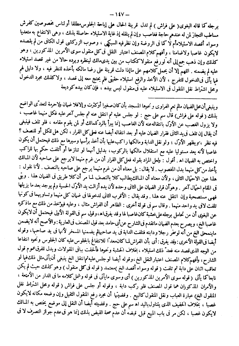 ـــــــــــــــــــــــــــــSوَيَنْبَغِي أَنَّ مَحَلَّ الضَّمَانِ مَا لَمْ تَعُمَّ الْفَرَاوِيُّ وَنَحْوُهَا الْمَسْجِدَ بِأَنْ كَانَ صَغِيرًا أَوْ كَثُرَتْ وَإِلَّا فَلَا ضَمَانَ وَلَا حُرْمَةَ لِتَعَدِّي الْوَاضِعِ بِذَلِكَ (قَوْلُهُ: عَلَى فِرَاشٍ) قَالَ سم عَلَى حَجّ: لَوْ جَلَسَ عَلَيْهِ ثُمَّ انْتَقَلَ عَنْهُ ثُمَّ جَلَسَ آخَرُ عَلَيْهِ فَكُلٌّ مِنْهُمَا غَاصِبٌ، وَلَا يَزُولُ الْغَصْبُ عَنْ الْأَوَّلِ بِانْتِقَالِهِ عَنْهُ لِأَنَّ الْغَاصِبَ إنَّمَا يَبْرَأُ بِالرَّدِّ لِلْمَالِكِ أَوْ لِمَنْ يَقُومُ مَقَامَهُ، فَلَوْ تَلِفَ فَيَنْبَغِي أَنْ يُقَالَ إنْ تَلِفَ فِي يَدِ الثَّانِي فَقَرَارُ الضَّمَانِ عَلَيْهِ أَوْ بَعْدَ انْتِقَالِهِ أَيْضًا عَنْهُ فَعَلَى كُلٍّ الْقَرَارُ، لَكِنْ هَلْ لِلْكُلِّ أَوْ لِلنِّصْفِ؟ فِيهِ نَظَرٌ، وَيَظْهَرُ الْأَوَّلُ؛ وَلَوْ نَقَلَ الدَّابَّةَ وَمَالِكُهَا رَاكِبٌ عَلَيْهَا بِأَنْ أَخَذَ بِرَأْسِهَا وَسَيَّرَهَا مَعَ ذَلِكَ فَيَحْتَمِلُ أَنْ يَكُونَ غَاصِبًا لِأَنَّهُ يُعَدُّ مُسْتَوْلِيًا عَلَيْهِ مَعَ اسْتِقْلَالِ مَالِكِهَا بِالرُّكُوبِ، بِدَلِيلِ أَنَّهُمَا لَوْ تَنَازَعَا أَوْ أُتْلِفَتْ حُكِمَ بِهَا لِلرَّاكِبِ وَاخْتُصَّ بِهِ الضَّمَانُ اهـ. أَقُولُ: وَلَعَلَّ الْمُرَادَ بِقَوْلِهِ فَعَلَى كُلٍّ الْقَرَارُ أَنَّ مَنْ غَرِمَ مِنْهُمَا لَا يَرْجِعُ عَلَى صَاحِبِهِ لِأَنَّ الْمَالِكَ يَأْخُذُ مِنْ كُلٍّ مِنْهُمَا بَدَلَ الْمَغْصُوبِ. لَا يُقَالُ: بَلْ مَعْنَاهُ أَنَّ مَنْ غَرِمَ مِنْهُمَا يَرْجِعُ عَلَى صَاحِبِهِ بِالنِّصْفِ.