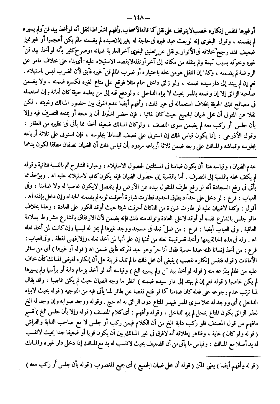 أَقُولُ: وَكَذَا لَا ضَمَانَ عَلَيْهِ لَوْ طَارَتْ شَرَارَةٌ مِنْ الدُّكَّانِ أَحْرَقَتْ شَيْئًا حَيْثُ أَوْقَدَ الْكُورَ عَلَى الْعَادَةِ، وَهَذَا بِخِلَافِ مَا لَوْ جَلَسَ بِالشَّارِعِ نَفْسِهِ أَوْ أَوْقَدَ لَا عَلَى الْعَادَةِ وَتَوَلَّدَ مِنْهُ ذَلِكَ فَإِنَّهُ يَضْمَنُ لِأَنَّ الِارْتِفَاقَ بِالشَّارِعِ مَشْرُوطٌ بِسَلَامَةِ الْعَاقِبَةِ. وَفِي الْعُبَابِ أَيْضًا: فَرْعٌ: مَنْ ضَلَّ نَعْلَهُ فِي مَسْجِدٍ وَوَجَدَ غَيْرَهَا لَمْ يَجُزْ لَهُ لُبْسُهَا وَإِنْ كَانَتْ لِمَنْ أَخَذَ نَعْلَهُ اهـ. وَلَهُ فِي هَذِهِ الْحَالَةِ بَيْعُهَا وَأَخْذُ قَدْرِ قِيمَةِ نَعْلِهِ مِنْ ثَمَنِهَا إنْ عَلِمَ أَنَّهَا لِمَنْ أَخَذَ نَعْلَهُ، وَإِلَّا فَهِيَ لُقَطَةٌ. وَفِي الْعُبَابِ: فَرْعٌ: مَنْ أَخَذَ إنْسَانًا ظَنَّهُ عَبْدًا حِسْبَةً فَقَالَ أَنَا حُرٌّ وَهُوَ عَبْدٌ فَتَرَكَهُ فَأَبَقَ ضَمِنَ اهـ (قَوْلُهُ: أَوْ غَيْرِهَا) أَيْ مِنْ سَائِرِ الْأَمَانَاتِ (قَوْلُهُ: فَنَفْسُ إنْكَارِهِ غَصْبٌ) يَنْبَغِي أَنَّ مَحَلَّ ذَلِكَ مَا لَمْ تَدُلَّ قَرِينَةٌ عَلَى أَنَّ إنْكَارَهُ لِغَرَضِ الْمَالِكِ كَأَنْ خَافَ عَلَيْهِ مِنْ ظَالِمٍ يَنْتَزِعُهُ مِنْهُ (قَوْلُهُ: لَوْ أَخَذَ بِيَدِ قِنٍّ وَلَمْ يُسَيِّرْهُ إلَخْ) وَقِيَاسُهُ أَنَّهُ لَوْ أَخَذَ بِزِمَامِ دَابَّةٍ أَوْ بِرَأْسِهَا وَلَمْ يُسَيِّرْهَا لَمْ يَكُنْ غَاصِبًا (قَوْلُهُ: نَعَمْ إنْ لَمْ يَهْتَدِ إلَى دَارِ سَيِّدِهِ ضَمِنَهُ) اُنْظُرْ مَا وَجْهُ الضَّمَانِ حَيْثُ لَمْ يَكُنْ غَاصِبًا، وَقَدْ يُقَالُ لَمَّا تَرَتَّبَ عَدَمُ رُجُوعِهِ عَلَى فِعْلِهِ كَانَ ضَامِنًا كَمَا لَوْ فَتَحَ قَفَصًا عَنْ طَائِرٍ لِمَا يَأْتِي فِيهِ مِنْ التَّوْجِيهِ (قَوْلُهُ: بِحَيْثُ لَا يَرَاهُ الدَّاخِلُ) أَيْ وَوَجَدَ لَهُ مَحَلًّا سِوَى الْمَمَرِّ فَيَهْدِرُ الْمَتَاعَ دُونَ الزَّالِقِ بِهِ اهـ حَجّ. وَقَوْلُهُ وَوَجَدَ صَوَابَهُ وَإِنْ وَجَدَ لَهُ إلَخْ لِعُذْرِ الزَّالِقِ بِكَوْنِ الْمَتَاعِ بِمَحَلٍّ لَمْ يَرَهُ الدَّاخِلُ، وَقَوْلُهُ وَأَفْهَمَ: أَيْ كَلَامُ الْمُصَنِّفِ (قَوْلُهُ: وَإِلَّا بِأَنْ جَلَسَ إلَخْ) قَسِيمُ مَا فُهِمَ مِنْ قَوْلِ الْمُصَنِّفِ فَلَوْ رَكِبَ دَابَّةً إلَخْ مِنْ أَنَّ الْكَلَامَ فِيمَنْ رَكِبَ أَوْ جَلَسَ لَا مَعَ صَاحِبِ الدَّابَّةِ وَالْفِرَاشِ