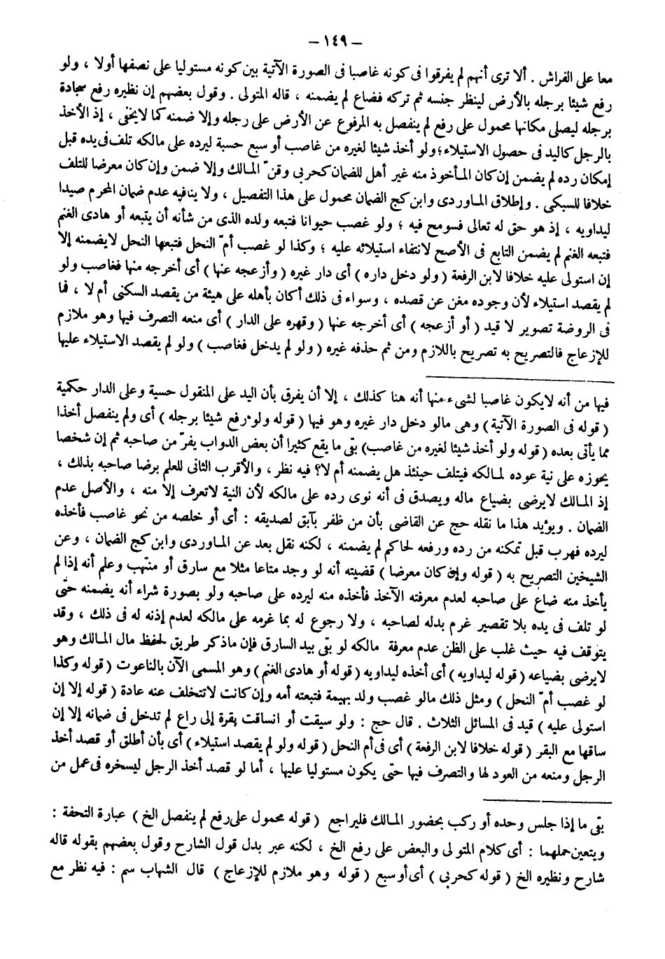 ـــــــــــــــــــــــــــــSفِيهَا مِنْ أَنَّهُ لَا يَكُونُ غَاصِبًا لِشَيْءٍ مِنْهَا أَنَّهُ هُنَا كَذَلِكَ، إلَّا أَنْ يُفَرَّقَ بِأَنَّ الْيَدَ عَلَى الْمَنْقُولِ حِسِّيَّةٌ وَعَلَى الدَّارِ حُكْمِيَّةٌ (قَوْلُهُ: فِي الصُّورَةِ الْآتِيَةِ) وَهِيَ مَا لَوْ دَخَلَ دَارَ غَيْرِهِ وَهُوَ فِيهَا (قَوْلُهُ وَلَوْ رَفَعَ شَيْئًا بِرِجْلِهِ) أَيْ وَلَمْ يَنْفَصِلْ أَخْذًا مِمَّا يَأْتِي بَعْدَهُ (قَوْلُهُ: وَلَوْ أَخَذَ شَيْئًا لِغَيْرِهِ مِنْ غَاصِبٍ) بَقِيَ مَا يَقَعُ كَثِيرًا أَنَّ بَعْضَ الدَّوَابِّ يَفِرُّ مِنْ صَاحِبِهِ ثُمَّ إنَّ شَخْصًا يَحُوزُهُ عَلَى نِيَّةِ عَوْدِهِ لِمَالِكِهِ فَيَتْلَفُ حِينَئِذٍ هَلْ يَضْمَنُهُ أَمْ لَا؟ فِيهِ نَظَرٌ، وَالْأَقْرَبُ الثَّانِي لِلْعِلْمِ بِرِضَا صَاحِبِهِ بِذَلِكَ، إذْ الْمَالِكُ لَا يَرْضَى بِضَيَاعِ مَالِهِ وَيُصَدَّقُ فِي أَنَّهُ نَوَى رَدَّهُ عَلَى مَالِكِهِ لِأَنَّ النِّيَّةَ لَا تُعْرَفُ إلَّا مِنْهُ، وَالْأَصْلُ عَدَمُ الضَّمَانِ. وَيُؤَيِّدُ هَذَا مَا نَقَلَهُ حَجّ عَنْ الْقَاضِي بِأَنَّ مَنْ ظَفِرَ بِآبِقٍ لِصَدِيقِهِ: أَيْ أَوْ خَلَّصَهُ مِنْ نَحْوِ غَاصِبٍ فَأَخَذَهُ لِيَرُدَّهُ فَهَرَبَ قَبْلَ تَمَكُّنِهِ مِنْ رَدِّهِ وَرَفَعَهُ لِحَاكِمٍ لَمْ يَضْمَنْهُ، لَكِنَّهُ نَقَلَ بَعْدُ عَنْ الْمَاوَرْدِيِّ وَابْنِ كَجٍّ الضَّمَانَ، وَعَنْ الشَّيْخَيْنِ التَّصْرِيحُ بِهِ (قَوْلُهُ وَإِنْ كَانَ مُعْرِضًا) قَضِيَّتُهُ أَنَّهُ لَوْ وَجَدَ مَتَاعًا مَثَلًا مَعَ سَارِقٍ أَوْ مُنْتَهِبٍ وَعَلِمَ أَنَّهُ إذَا لَمْ يَأْخُذْ مِنْهُ ضَاعَ عَلَى صَاحِبِهِ لِعَدَمِ مَعْرِفَتِهِ الْآخِذَ فَأَخَذَهُ مِنْهُ لِيَرُدَّهُ عَلَى صَاحِبِهِ وَلَوْ بِصُورَةِ شِرَاءٍ أَنَّهُ يَضْمَنُهُ حَتَّى لَوْ تَلِفَ فِي يَدِهِ بِلَا تَقْصِيرٍ غَرِمَ بَدَلَهُ لِصَاحِبِهِ، وَلَا رُجُوعَ لَهُ بِمَا غَرِمَهُ عَلَى مَالِكِهِ لِعَدَمِ إذْنِهِ لَهُ فِي ذَلِكَ، وَقَدْ يَتَوَقَّفُ فِيهِ حَيْثُ غَلَبَ عَلَى الظَّنِّ عَدَمُ مَعْرِفَةِ مَالِكِهِ لَوْ بَقِيَ بِيَدِ السَّارِقِ فَإِنَّ مَا ذَكَرَ طَرِيقٌ لِحِفْظِ مَالِ الْمَالِكِ وَهُوَ لَا يَرْضَى بِضَيَاعِهِ (قَوْلُهُ: لِيُدَاوِيَهُ) أَيْ أَخَذَهُ لِيُدَاوِيَهُ (قَوْلُهُ: أَوْ هَادِي الْغَنَمِ) وَهُوَ الْمُسَمَّى الْآنَ بِالنَّاعُوتِ (قَوْلُهُ: وَكَذَا لَوْ غَصَبَ أُمَّ النَّحْلِ) وَمِثْلُ ذَلِكَ مَا لَوْ غَصَبَ وَلَدَ بَهِيمَةٍ فَتَبِعَتْهُ أُمُّهُ وَإِنْ كَانَتْ لَا تَتَخَلَّفُ عَنْهُ عَادَةً (قَوْلُهُ إلَّا إنْ اسْتَوْلَى عَلَيْهِ) قَيْدٌ فِي الْمَسَائِلِ الثَّلَاثِ. قَالَ حَجّ: وَلَوْ سِيقَتْ أَوْ انْسَاقَتْ بَقَرَةٌ إلَى رَاعٍ لَمْ تَدْخُلْ فِي ضَمَانِهِ إلَّا إنْ سَاقَهَا مَعَ الْبَقَرِ (قَوْلُهُ: خِلَافًا لِابْنِ الرِّفْعَةِ) أَيْ فِي أُمِّ النَّحْلِ.