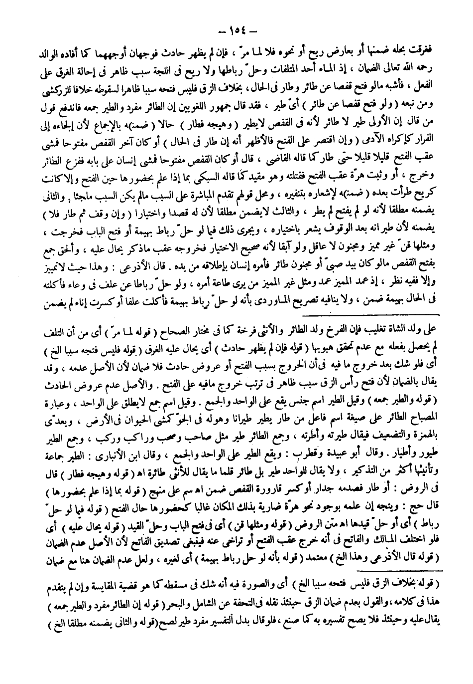 (قَوْلُهُ: وَالطَّيْرُ جَمْعُهُ) وَقِيلَ الطَّيْرُ اسْمُ جِنْسٍ يَقَعُ عَلَى الْوَاحِدِ وَالْجَمْعِ. وَقِيلَ اسْمُ جَمْعٍ لَا يُطْلَقُ عَلَى الْوَاحِدِ، وَعِبَارَةُ الْمِصْبَاحِ: الطَّائِرُ عَلَى صِيغَةِ اسْمِ فَاعِلٍ مِنْ طَارَ يَطِيرُ طَيَرَانًا وَهُوَ لَهُ فِي الْجَوِّ كَمَشْيِ الْحَيَوَانِ فِي الْأَرْضِ، وَيُعَدَّى بِالْهَمْزَةِ وَالتَّضْعِيفِ فَيُقَالُ طَيَّرْتُهُ وَأَطَرْتُهُ، وَجَمْعُ الطَّائِرِ طَيْرٌ مِثْلُ صَاحِبٍ وَصَحْبٍ وَرَاكِبٍ وَرَكْبٍ، وَجَمْعُ الطَّيْرِ طُيُورٌ وَأَطْيَارٌ. وَقَالَ أَبُو عُبَيْدَةَ وَقُطْرُبٌ: وَيَقَعُ الطَّيْرُ عَلَى الْوَاحِدِ وَالْجَمْعِ، وَقَالَ ابْنُ الْأَنْبَارِيِّ: الطَّيْرُ جَمَاعَةٌ وَتَأْنِيثُهَا أَكْثَرُ مِنْ التَّذْكِيرِ، وَلَا يُقَالُ لِلْوَاحِدِ طَيْرٌ بَلْ طَائِرٌ قَلَّمَا مَا يُقَالُ لِلْأُنْثَى طَائِرَةٌ اهـ (قَوْلُهُ: وَهَيَّجَهُ فَطَارَ) قَالَ فِي الرَّوْضِ: أَوْ طَارَ فَصَدَمَهُ جِدَارٌ أَوْ كَسَرَ قَارُورَةَ الْقَفَصِ ضَمِنَ اهـ سم عَلَى مَنْهَجٍ (قَوْلُهُ: بِمَا إذَا عَلِمَ بِحُضُورِهَا) قَالَ حَجّ: وَيَتَّجِهُ أَنَّ عِلْمَهُ بِوُجُودِ نَحْوِ هِرَّةٍ ضَارِيَةٍ بِذَلِكَ الْمَكَانِ غَالِبًا كَحُضُورِهَا حَالَ الْفَتْحِ (قَوْلُهُ: فِيمَا لَوْ حَلَّ رِبَاطَ) أَيْ أَوْ حَلَّ قَيْدَهَا اهـ مَتْنُ الرَّوْضِ (قَوْلُهُ: وَمِثْلُهَا قِنٌّ) أَيْ فِي فَتْحِ الْبَابِ وَحَلِّ الْقَيْدِ (قَوْلُهُ: يُحَالُ عَلَيْهِ) أَيْ فَلَوْ اخْتَلَفَ الْمَالِكُ وَالْفَاتِحُ فِي أَنَّهُ خَرَجَ عَقِبَ الْفَتْحِ أَوْ تَرَاخَى عَنْهُ فَيَنْبَغِي تَصْدِيقُ الْفَاتِحِ لِأَنَّ الْأَصْلَ عَدَمُ الضَّمَانِ (قَوْلُهُ: قَالَ الْأَذْرَعِيُّ وَهَذَا إلَخْ) مُعْتَمَدٌ (قَوْلُهُ بِأَنَّهُ لَوْ حَلَّ رِبَاطَ بَهِيمَةٍ) أَيْ لِغَيْرِهِ، وَلَعَلَّ عَدَمَ الضَّمَانِ هُنَا مَعَ ضَمَانِ