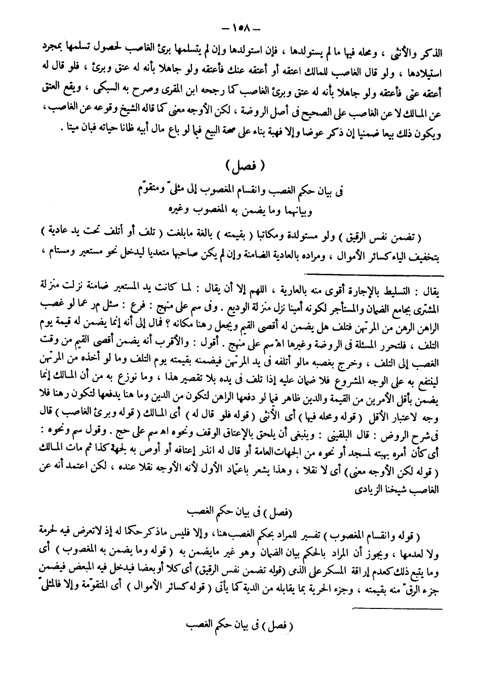 (فَصْلٌ) فِي بَيَانِ حُكْمِ الْغَصْبِ (قَوْلُهُ: وَانْقِسَامُ الْمَغْصُوبِ) تَفْسِيرٌ لِلْمُرَادِ بِحُكْمِ الْغَصْبِ هُنَا، وَإِلَّا فَلَيْسَ مَا ذَكَرَ حُكْمًا لَهُ إذْ لَا تَعَرُّضَ فِيهِ لِحُرْمَةٍ وَلَا لِعَدَمِهَا، وَيَجُوزُ أَنَّ الْمُرَادَ بِالْحُكْمِ بَيَانُ الضَّمَانِ وَهُوَ غَيْرُ مَا يَضْمَنُ بِهِ (قَوْلُهُ: وَمَا يَضْمَنُ بِهِ الْمَغْصُوبَ) أَيْ وَمَا يَتْبَعُ ذَلِكَ كَعَدَمِ إرَاقَةِ الْمُسْكِرِ عَلَى الذِّمِّيِّ (قَوْلُهُ: تُضْمَنُ نَفْسُ الرَّقِيقِ) أَيْ كُلًّا أَوْ بَعْضًا فَيَدْخُلُ فِيهِ الْمُبَعَّضُ فَيُضْمَنُ جُزْءُ الرِّقِّ مِنْهُ بِقِيمَتِهِ، وَجُزْءُ الْحُرِّيَّةِ بِمَا يُقَابِلُهُ مِنْ الدِّيَةِ كَمَا يَأْتِي (قَوْلُهُ: كَسَائِرِ الْأَمْوَالِ) أَيْ الْمُتَقَوِّمَةِ وَإِلَّا فَالْمِثْلِيُّ