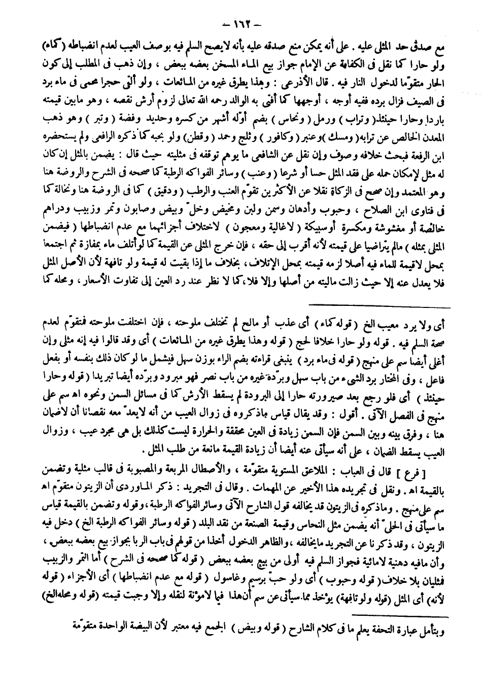 مَعَ صِدْقِ حَدِّ الْمِثْلِيِّ عَلَيْهِ. عَلَى أَنَّهُ يُمْكِنُ مَنْعُ صِدْقِهِ عَلَيْهِ بِأَنَّهُ لَا يَصِحُّ السَّلَمُ فِيهِ بِوَصْفِ الْعَيْبِ لِعَدَمِ انْضِبَاطِهِ (كَمَاءٍ) وَلَوْ حَارًّا كَمَا نُقِلَ فِي الْكِفَايَةِ عَنْ الْإِمَامِ جَوَازُ بَيْعِ الْمَاءِ الْمُسَخَّنِ بَعْضِهِ بِبَعْضٍ، وَإِنْ ذَهَبَ فِي الْمَطْلَبِ إلَى كَوْنِ الْحَارِّ مُتَقَوِّمًا لِدُخُولِ النَّارِ فِيهِ. قَالَ الْأَذْرَعِيُّ: وَهَذَا يَطْرُقُ غَيْرَهُ مِنْ الْمَائِعَاتِ، وَلَوْ أَلْقَى حَجَرًا مُحْمًى فِي مَاءٍ بَرُدَ فِي الصَّيْفِ فَزَالَ بَرْدُهُ فَفِيهِ أَوْجُهٌ، أَوْجَهُهَا كَمَا أَفْتَى بِهِ الْوَالِدُ - رَحِمَهُ اللَّهُ تَعَالَى - لُزُومُ أَرْشِ نَقْصِهِ.