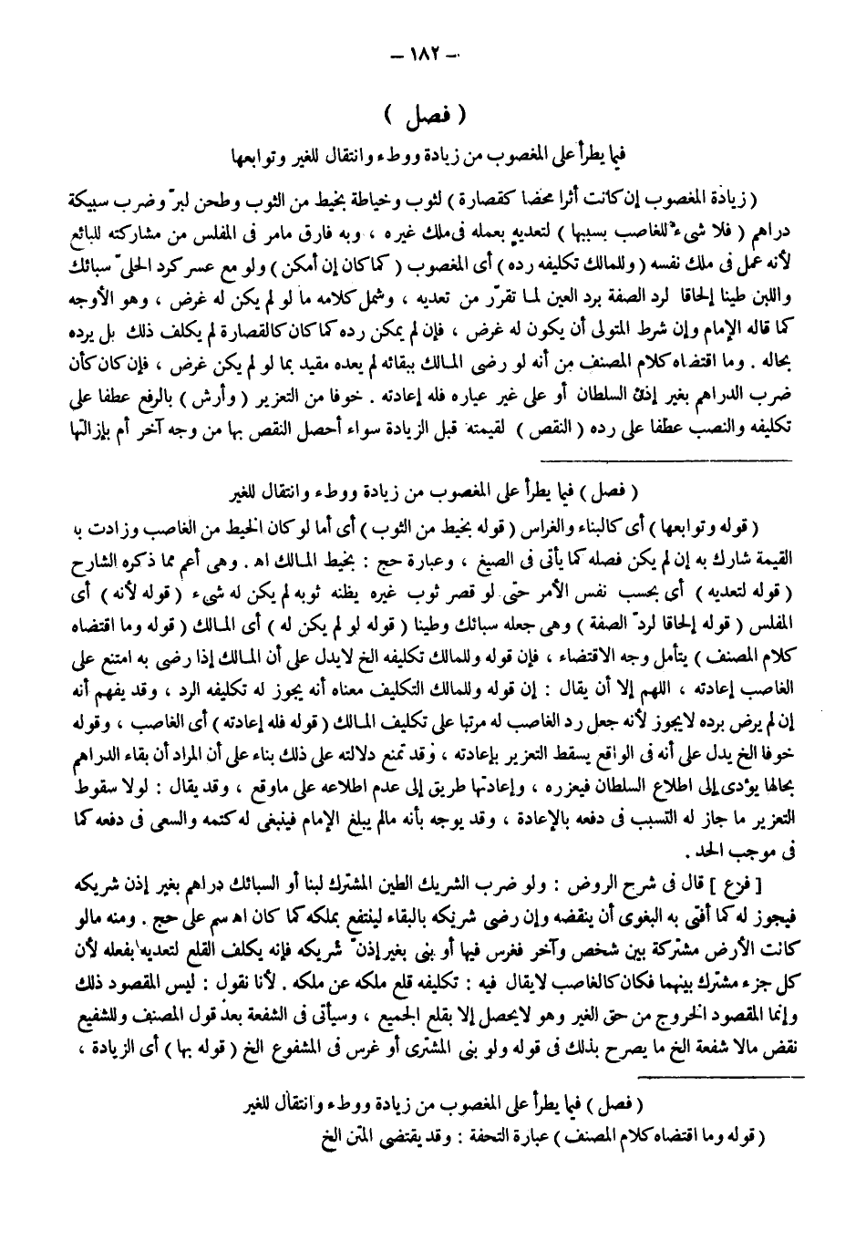 ـــــــــــــــــــــــــــــSفَصْلٌ) فِيمَا يَطْرَأُ عَلَى الْمَغْصُوبِ مِنْ زِيَادَةٍ وَوَطْءٍ وَانْتِقَالٍ لِلْغَيْرِ (قَوْلُهُ: وَتَوَابِعِهَا) أَيْ كَالْبِنَاءِ وَالْغِرَاسِ (قَوْلُهُ: بِخَيْطٍ مِنْ الثَّوْبِ) أَيْ أَمَّا لَوْ كَانَ الْخَيْطُ مِنْ الْغَاصِبِ وَزَادَتْ بِهِ الْقِيمَةُ شَارَكَ بِهِ إنْ لَمْ يَكُنْ فَصَلَهُ كَمَا يَأْتِي فِي الصِّيَغِ، وَعِبَارَةُ حَجّ: بِخَيْطِ الْمَالِكِ اهـ. وَهِيَ أَعَمُّ مِمَّا ذَكَرَهُ الشَّارِحُ (قَوْلُهُ: لِتَعَدِّيهِ) أَيْ بِحَسَبِ نَفْسِ الْأَمْرِ حَتَّى لَوْ قَصَّرَ ثَوْبَ غَيْرِهِ يَظُنُّهُ ثَوْبَهُ لَمْ يَكُنْ لَهُ شَيْءٌ (قَوْلُهُ: لِأَنَّهُ) أَيْ الْمُفْلِسَ (قَوْلُهُ: إلْحَاقًا لِرَدِّ الصِّفَةِ) وَهِيَ جَعْلُهُ سَبَائِكَ وَطِينًا