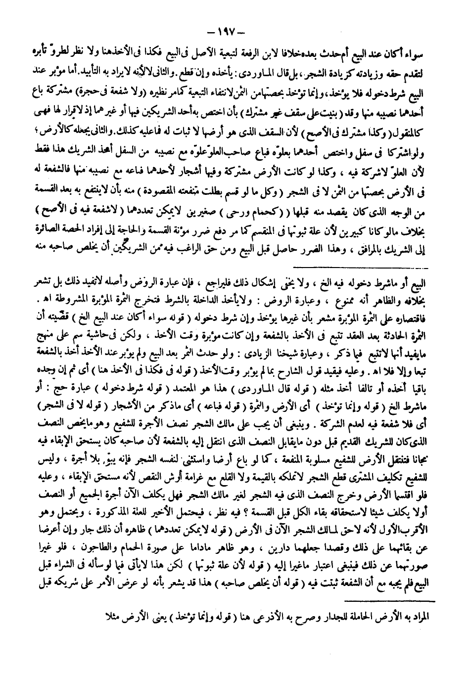 وَيَنْبَغِي أَنْ يَجِبَ عَلَى مَالِكِ الشَّجَرِ نِصْفُ الْأُجْرَةِ لِلشَّفِيعِ وَهُوَ مَا يَخُصُّ النِّصْفَ الَّذِي كَانَ لِلشَّرِيكِ الْقَدِيمِ قَبِلَ دُونَ مَا يُقَابِلُ النِّصْفَ الَّذِي انْتَقَلَ إلَيْهِ بِالشُّفْعَةِ لِأَنَّ صَاحِبَهُ كَانَ يَسْتَحِقُّ الْإِبْقَاءَ فِيهِ مَجَّانًا فَتَنْتَقِلُ الْأَرْضُ لِلشَّفِيعِ مَسْلُوبَةَ الْمَنْفَعَةِ، كَمَا لَوْ بَاعَ أَرْضًا وَاسْتَثْنَى لِنَفْسِهِ الشَّجَرَ فَإِنَّهُ يَبْقَى بِلَا أُجْرَةٍ، وَلَيْسَ لِلشَّفِيعِ تَكْلِيفُ الْمُشْتَرِي قَطْعَ الشَّجَرِ لَا تَمَلُّكَهُ بِالْقِيمَةِ وَلَا الْقَلْعَ مَعَ غَرَامَةِ أَرْشِ النَّقْصِ لِأَنَّهُ مُسْتَحِقُّ الْإِبْقَاءِ، وَعَلَيْهِ فَلَوْ اقْتَسَمَا الْأَرْضَ وَخَرَجَ النِّصْفُ الَّذِي فِيهِ الشَّجَرُ لِغَيْرِ مَالِكِ الشَّجَرِ فَهَلْ يُكَلَّفُ الْآنَ أُجْرَةَ الْجَمِيعِ أَوْ النِّصْفِ أَوْ لَا يُكَلَّفُ شَيْئًا لِاسْتِحْقَاقِهِ بَقَاءَ الْكُلِّ قَبْلَ الْقِسْمَةِ؟ فِيهِ نَظَرٌ، فَيُحْتَمَلُ الْأَخِيرُ لِلْعِلَّةِ الْمَذْكُورَةِ، وَيُحْتَمَلُ وَهُوَ الْأَقْرَبُ الْأَوَّلُ لِأَنَّهُ لَا حَقَّ لِمَالِكِ الشَّجَرِ الْآنَ فِي الْأَرْضِ (قَوْلُهُ: لَا يُمْكِنُ تَعَدُّدُهُمَا) ظَاهِرُهُ أَنَّ ذَلِكَ جَارٍ وَإِنْ أَعْرَضَا عَنْ بَقَائِهِمَا عَلَى ذَلِكَ وَقَصَدَا جَعْلَهُمَا دَارَيْنِ، وَهُوَ ظَاهِرٌ مَا دَامَا عَلَى صُورَةِ الْحَمَّامِ وَالطَّاحُونِ، فَلَوْ غَيَّرَا صُورَتَهُمَا عَنْ ذَلِكَ فَيَنْبَغِي اعْتِبَارُ مَا غَيَّرَا إلَيْهِ (قَوْلُهُ: لِأَنَّ عِلَّةَ ثُبُوتِهَا) لَكِنْ هَذَا لَا يَتَأَتَّى فِيمَا لَوْ سَأَلَهُ فِي الشِّرَاءِ قَبْلَ الْبَيْعِ فَلَمْ يُجِبْهُ مَعَ أَنَّ الشُّفْعَةَ ثَبَتَتْ فِيهِ (قَوْلُهُ: أَنْ يُخَلِّصَ صَاحِبَهُ) هَذَا قَدْ يُشْعِرُ بِأَنَّهُ لَوْ عَرَضَ الْأَمْرَ عَلَى شَرِيكِهِ قَبْلَ