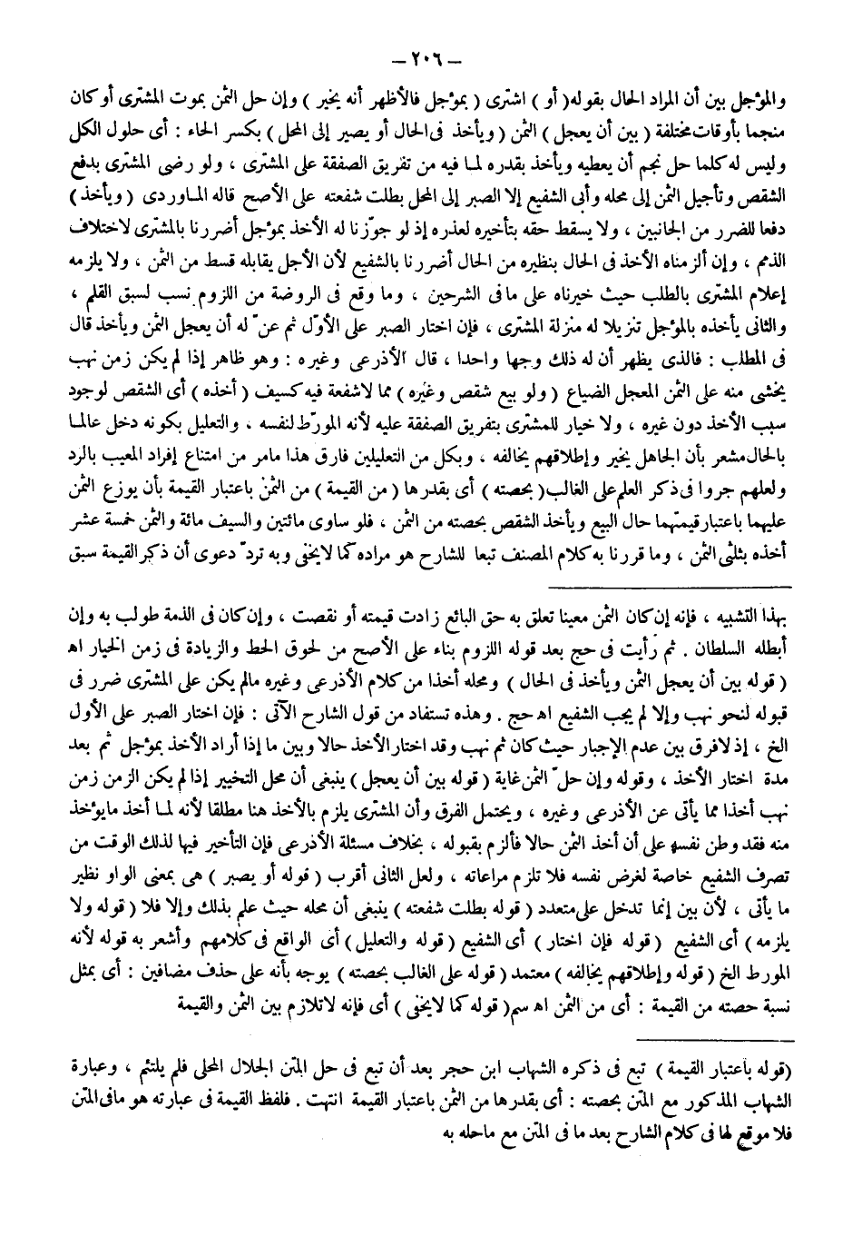 ثُمَّ رَأَيْت فِي حَجّ بَعْدَ قَوْلِهِ اللُّزُومَ بِنَاءً عَلَى الْأَصَحِّ مِنْ لُحُوقِ الْحَطِّ وَالزِّيَادَةِ فِي زَمَنِ الْخِيَارِ اهـ (قَوْلُهُ: بَيْنَ أَنْ يُعَجِّلَ الثَّمَنَ وَيَأْخُذَ فِي الْحَالِ) وَمَحِلُّهُ أَخْذًا مِنْ كَلَامِ الْأَذْرَعِيِّ وَغَيْرِهِ مَا لَمْ يَكُنْ عَلَى الْمُشْتَرِي ضَرَرٌ فِي قَبُولِهِ لِنَحْوِ نَهْبٍ، وَإِلَّا لَمْ يَجِبْ الشَّفِيعُ اهـ حَجّ.