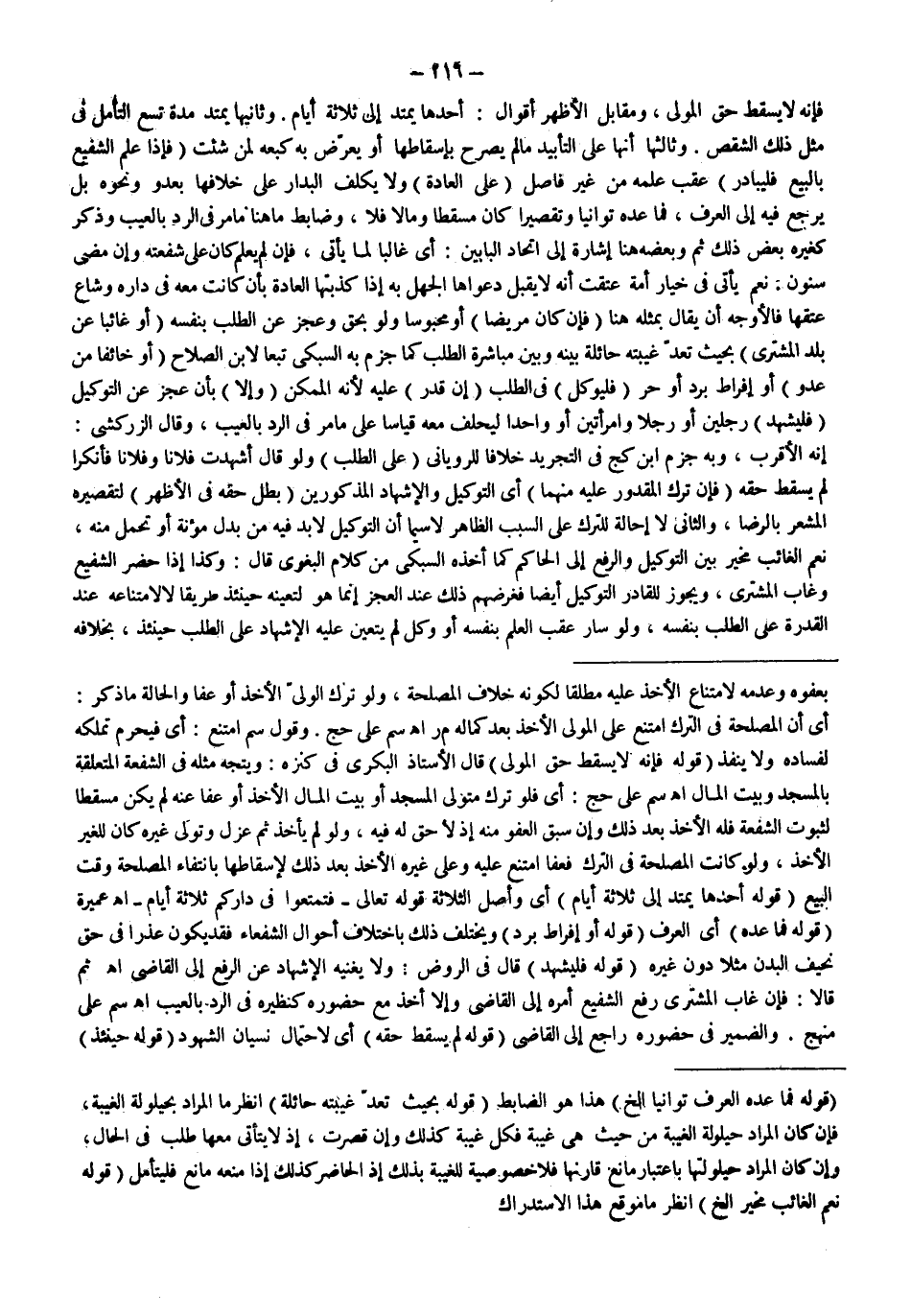 ـــــــــــــــــــــــــــــSبِعَفْوِهِ وَعَدَمِهِ لِامْتِنَاعِ الْأَخْذِ عَلَيْهِ مُطْلَقًا لِكَوْنِهِ خِلَافَ الْمَصْلَحَةِ، وَلَوْ تَرَكَ الْوَلِيُّ الْأَخْذَ أَوْ عَفَا وَالْحَالَةُ مَا ذَكَرَ: أَيْ أَنَّ الْمَصْلَحَةَ فِي التَّرْكِ امْتَنَعَ عَلَى الْمُوَلِّي الْأَخْذُ بَعْدَ كَمَالِهِ م ر اهـ سم عَلَى حَجّ وَقَوْلُ سم امْتَنَعَ: أَيْ فَيَحْرُمُ تَمَلُّكُهُ لِفَسَادِهِ وَلَا يَنْفُذُ (قَوْلُهُ: فَإِنَّهُ لَا يَسْقُطُ حَقُّ الْمُوَلِّي) قَالَ الْأُسْتَاذُ الْبَكْرِيُّ فِي كَنْزِهِ: وَيَتَّجِهُ مِثْلُهُ فِي الشُّفْعَةِ الْمُتَعَلِّقَةِ بِالْمَسْجِدِ وَبَيْتِ الْمَالِ اهـ سم عَلَى حَجّ: أَيْ فَلَوْ تَرَكَ مُتَوَلِّي الْمَسْجِدِ أَوْ بَيْتِ الْمَالِ الْأَخْذَ أَوْ عَفَا عَنْهُ لَمْ يَكُنْ مُسْقِطًا لِثُبُوتِ الشُّفْعَةِ، فَلَهُ الْأَخْذُ بَعْدَ ذَلِكَ، وَإِنْ سَبَقَ الْعَفْوُ مِنْهُ إذْ لَا حَقَّ لَهُ فِيهِ، وَلَوْ لَمْ يَأْخُذْ ثُمَّ عُزِلَ وَتَوَلَّى غَيْرُهُ كَانَ لِلْغَيْرِ الْأَخْذُ، وَلَوْ كَانَتْ الْمَصْلَحَةُ فِي التَّرْكِ فَعَفَا امْتَنَعَ عَلَيْهِ وَعَلَى غَيْرِهِ الْأَخْذُ بَعْدَ ذَلِكَ لِإِسْقَاطِهَا بِانْتِفَاءِ الْمَصْلَحَةِ وَقْتَ الْبَيْعِ (قَوْلُهُ: أَحَدُهَا يَمْتَدُّ إلَى ثَلَاثَةِ أَيَّامٍ) أَيْ وَأَصْلُ الثَّلَاثَةِ قَوْله تَعَالَى {تَمَتَّعُوا فِي دَارِكُمْ ثَلاثَةَ أَيَّامٍ} [هود: 65] اهـ عَمِيرَةُ