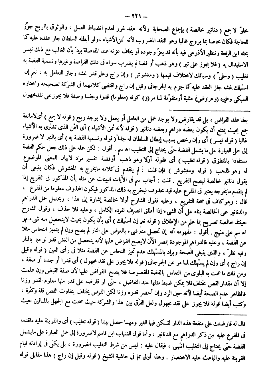 خُلُوٍّ لَا جَمْعٍ (دَنَانِيرَ خَالِصَةً) بِإِجْمَاعِ الصَّحَابَةِ وَلِأَنَّهُ عَقْدُ غَرَرٍ لِعَدَمِ انْضِبَاطِ الْعَمَلِ، وَالْوُثُوقِ بِالرِّبْحِ جُوِّزَ لِلْحَاجَةِ فَكَانَ خَاصًّا بِمَا يَرُوجُ غَالِبًا وَهُوَ النَّقْدُ الْمَضْرُوبُ لِأَنَّهُ ثَمَنُ الْأَشْيَاءِ، وَلَوْ أَبْطَلَهُ السُّلْطَانُ جَازَ عَقْدُهُ عَلَيْهِ كَمَا بَحَثَهُ ابْنُ الرِّفْعَةِ وَتَنْظِيرُ الْأَذْرَعِيِّ فِيهِ بِأَنَّهُ قَدْ يَعِزُّ وُجُودُهُ أَوْ يُخَافُ عِزَّتُهُ عِنْدَ الْمُفَاصَلَةِ يُرَدُّ بِأَنَّ الْغَالِبَ مَعَ ذَلِكَ تَيَسُّرُ الِاسْتِبْدَالِ بِهِ (فَلَا يَجُوزُ عَلَى تِبْرٍ) وَهُوَ ذَهَبٌ أَوْ فِضَّةٌ لَمْ يُضْرَبْ سَوَاءٌ فِي ذَلِكَ الْقِرَاضَةُ وَغَيْرُهَا وَتَسْمِيَةُ الْفِضَّةِ بِهِ تَغْلِيبٌ (وَحُلِيٍّ) وَسَبَائِكَ لِاخْتِلَافِ قِيَمِهَا (وَمَغْشُوشٍ) وَإِنْ رَاجَ وَعُلِمَ قَدْرُ غِشِّهِ وَجَازَ التَّعَامُلُ بِهِ، نَعَمْ إنْ اسْتَهْلَكَ غِشُّهُ جَازَ الْعَقْدُ عَلَيْهِ كَمَا جَزَمَ بِهِ الْجُرْجَانِيُّ وَقِيلَ إنْ رَاجَ وَاقْتَضَى كَلَامُهُمَا فِي الشَّرِكَةِ تَصْحِيحَهُ وَاخْتَارَهُ السُّبْكِيُّ وَغَيْرُهُ (وَعُرُوضٍ) مِثْلِيَّةٍ أَوْ مُتَقَوِّمَةٍ لِمَا مَرَّ