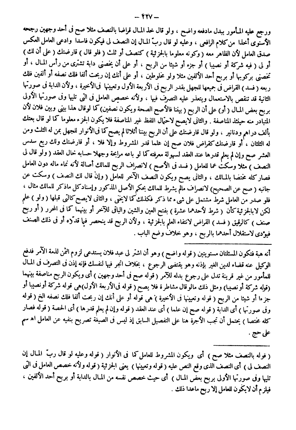ـــــــــــــــــــــــــــــQقَوْلُهُ: بِالنِّصْفِ مَثَلًا صَحَّ) أَيْ: وَيَكُونُ الْمَشْرُوطُ لِلْعَامِلِ كَمَا فِي الْأَنْوَارِ (قَوْلُهُ: وَعَلَيْهِ لَوْ قَالَ رَبُّ الْمَالِ إنَّ النِّصْفَ لِي) أَيْ: النِّصْفُ الَّذِي وَقَعَ النَّصُّ عَلَيْهِ. (قَوْلُهُ: وَتَعْيِينُهَا) يَعْنِي الْجُزْئِيَّةَ (قَوْلُهُ:؛ وَلِأَنَّهُ خَصَّصَ الْعَامِلَ فِي الَّتِي تَلِيهَا وَفِي صُورَتِهَا الْأُولَى بِرِبْحِ بَعْضِ الْمَالِ) أَيْ: حَيْثُ خَصَّصَ نَفْسَهُ مِنْ الْمَالِ بِالدَّابَّةِ أَوْ بِرِبْحِ أَحَدِ الْأَلْفَيْنِ، فَيَلْزَمُ أَنْ لَا يَكُونَ لِلْعَامِلِ إلَّا رِبْحُ مَا عَدَا ذَلِكَ.