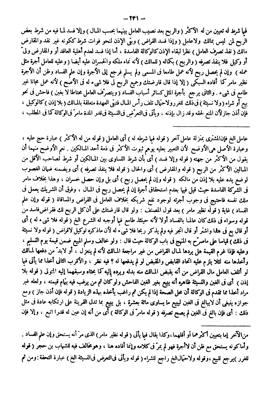 نَعَمْ الْأَوْضَحُ مِنْهُمَا أَنْ يَقُولَ مِنْ الْأَكْثَرِ مِنْ جِهَتِهِ (قَوْلُهُ: وَإِلَّا فَسَدَ) أَيْ بِأَنْ شَرَطَ التَّسَاوِيَ بَيْنَ الْمَالِكَيْنِ أَوْ شَرَطَ لِصَاحِبِ الْأَقَلِّ مِنْ الْمَالَيْنِ الْأَكْثَرَ مِنْ الرِّبْحِ