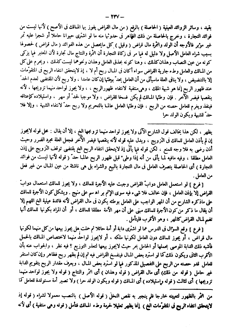 [فَرْعٌ] وَقَعَ السُّؤَالُ فِي الدَّرْسِ عَمَّا لَوْ اشْتَرَى دَابَّةً أَوْ أَمَةً حَائِلًا ثُمَّ حَمَلَتْ هَلْ يَجُوزُ بَيْعُهَا مِنْ كُلٍّ مِنْهُمَا لِكَوْنِهَا مَالَ قِرَاضٍ، أَوْ يَجُوزُ لِلْمَالِكِ دُونَ الْعَامِلِ لِكَوْنِهَا مِلْكَهُ، أَوْ لَا يَجُوزُ لِوَاحِدٍ مِنْهُمَا لِاخْتِصَاصِ الْمَالِكِ بِالْحَمْلِ فَأَشْبَهَ ذَلِكَ الدَّابَّةَ الْمُوصَى بِحَمْلِهَا أَوْ الْحَامِلِ بِحُرٍّ حَيْثُ لَا يَجُوزُ بَيْعُهَا لِتَعَذُّرِ التَّوْزِيعِ؟ فِيهِ نَظَرٌ، وَالْجَوَابُ عَنْهُ بِأَنَّ الْأَقْرَبَ الثَّانِي وَيَكُونُ ذَلِكَ كَمَا لَوْ اسْتَرَدَّ بَعْضَ الْمَالِ فَيَنْفَسِخُ الْقِرَاضُ فِيهِ ثُمَّ إنْ لَمْ يَظْهَرْ رِبْحٌ فَظَاهِرٌ وَإِنْ كَانَ اسْتَقَرَّ لِلْعَامِلِ قَدْرَ حِصَّتِهِ مِنْ الرِّبْحِ عَلَى التَّفْصِيلِ الْمَذْكُورِ فِيمَا لَوْ اسْتَرَدَّ بَعْضَ الْمَالِ، وَيُعْرَفُ مِقْدَارُ الرِّبْحِ بِتَقْوِيمِ الدَّابَّةِ غَيْرَ حَامِلٍ (قَوْلُهُ: مِنْ ذَلِكَ) أَيْ مَالِ الْقِرَاضِ (قَوْلُهُ: وَهَذَانِ) أَيْ الثَّمَرُ وَالنِّتَاجُ (قَوْلُهُ: وَلَا يَجُوزُ لِوَاحِدٍ مِنْهُمَا تَزْوِيجُهَا) أَيْ لِثَالِثٍ (قَوْلُهُ وَاسْتِيلَادُهُ) أَيْ الْمَالِكُ (قَوْلُهُ: وَيَكُونُ الْوَلَدُ حُرًّا) وَلَا تَصِيرُ أَمَةً مُسْتَوْلَدَةً لِلْعَامِلِ كَمَا