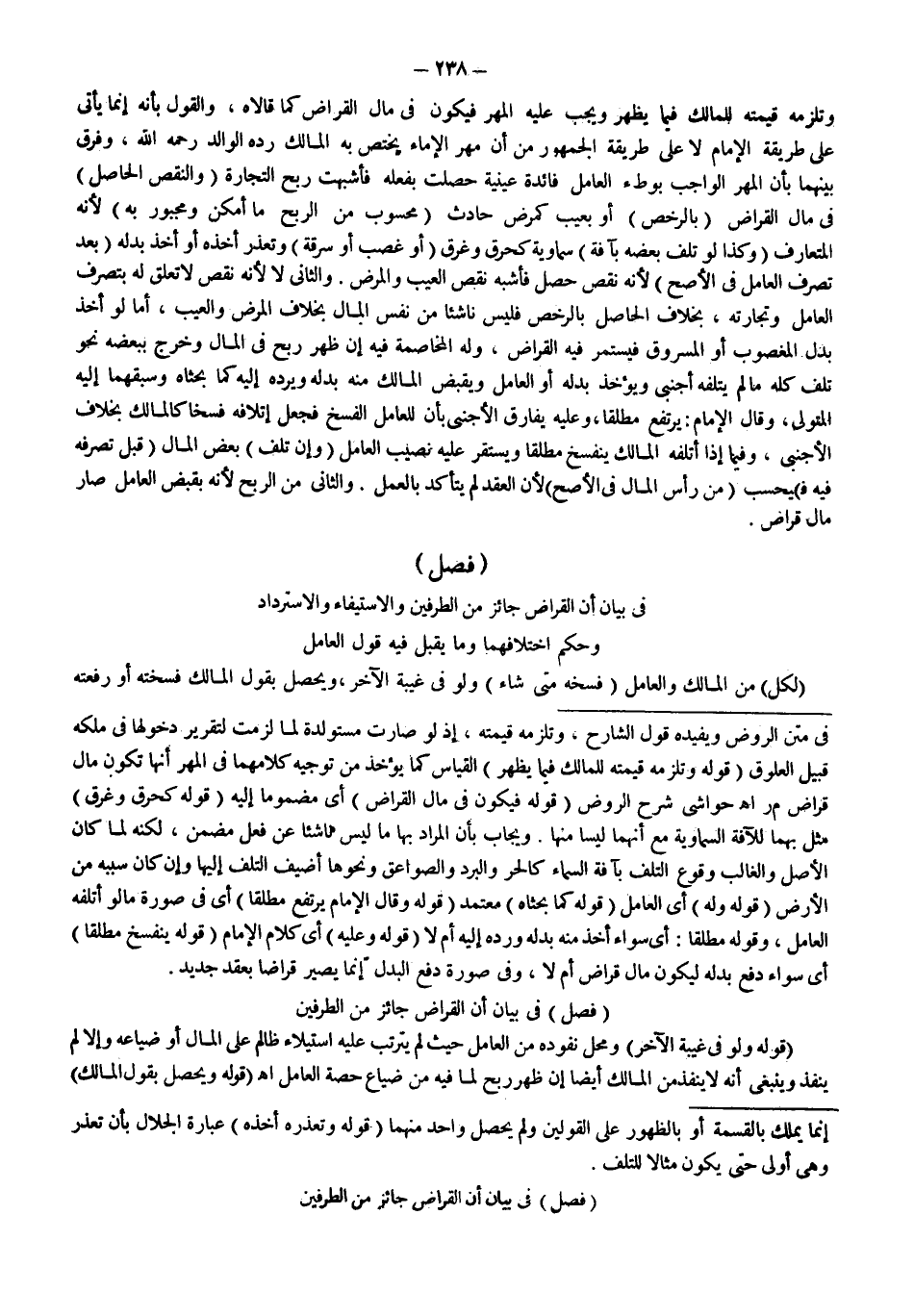 (وَالنَّقْصُ الْحَاصِلُ) فِي مَالِ الْقِرَاضِ (بِالرُّخَصِ) أَوْ بِعَيْبٍ كَمَرَضٍ حَادِثٍ (مَحْسُوبٌ مِنْ الرِّبْحِ مَا أَمْكَنَ وَمَجْبُورٌ بِهِ) لِأَنَّهُ الْمُتَعَارَفُ (وَكَذَا لَوْ تَلِفَ بَعْضُهُ بِآفَةٍ) سَمَاوِيَّةٍ كَحَرْقٍ وَغَرَقٍ (أَوْ غَصْبٍ أَوْ سَرِقَةٍ) وَتَعَذَّرَ أَخْذُهُ أَوْ أَخْذُ بَدَلِهِ (بَعْدَ تَصَرُّفِ الْعَامِلِ فِي الْأَصَحِّ) لِأَنَّهُ نَقْصٌ حَصَلَ فَأَشْبَهَ نَقْصَ الْعَيْبِ وَالْمَرَضِ. وَالثَّانِي لَا لِأَنَّهُ نَقْصٌ لَا تَعَلُّقَ لَهُ بِتَصَرُّفِ الْعَامِلِ وَتِجَارَتِهِ، بِخِلَافِ الْحَاصِلِ بِالرُّخَصِ فَلَيْسَ نَاشِئًا مِنْ نَفْسِ الْمَالِ بِخِلَافِ الْمَرَضِ وَالْعَيْبِ، أَمَّا لَوْ أُخِذَ بَدَلَ الْمَغْصُوبِ أَوْ الْمَسْرُوقِ فَيَسْتَمِرُّ فِيهِ الْقِرَاضُ، وَلَهُ الْمُخَاصَمَةُ فِيهِ إنْ ظَهَرَ رِبْحٌ فِي الْمَالِ وَخَرَجَ بِبَعْضِهِ، نَحْوُ تَلَفِ كُلِّهِ مَا لَمْ يُتْلِفْهُ أَجْنَبِيٌّ وَيُؤْخَذُ بَدَلُهُ أَوْ الْعَامِلُ وَيَقْبِضُ الْمَالِكُ مِنْهُ بَدَلَهُ وَيَرُدُّهُ إلَيْهِ كَمَا بَحَثَاهُ وَسَبَقَهُمَا إلَيْهِ الْمُتَوَلِّي، وَقَالَ الْإِمَامُ: يَرْتَفِعُ مُطْلَقًا، وَعَلَيْهِ يُفَارِقُ الْأَجْنَبِيَّ بِأَنَّ لِلْعَامِلِ الْفَسْخَ فَجَعَلَ إتْلَافَهُ فَسْخًا كَالْمَالِكِ بِخِلَافِ الْأَجْنَبِيِّ، وَفِيمَا إذَا أَتْلَفَهُ الْمَالِكُ يَنْفَسِخُ مُطْلَقًا وَيَسْتَقِرُّ عَلَيْهِ نَصِيبُ الْعَامِلِ (وَإِنْ) (تَلِفَ) بَعْضُ الْمَالِ (قَبْلَ تَصَرُّفِهِ فِيهِ) (فَ) يُحْسَبُ (مِنْ رَأْسِ الْمَالِ فِي الْأَصَحِّ) لِأَنَّ الْعَقْدَ لَمْ يَتَأَكَّدْ بِالْعَمَلِ. وَالثَّانِي مِنْ الرِّبْحِ لِأَنَّهُ بِقَبْضِ الْعَامِلِ صَارَ مَالَ قِرَاضٍ.