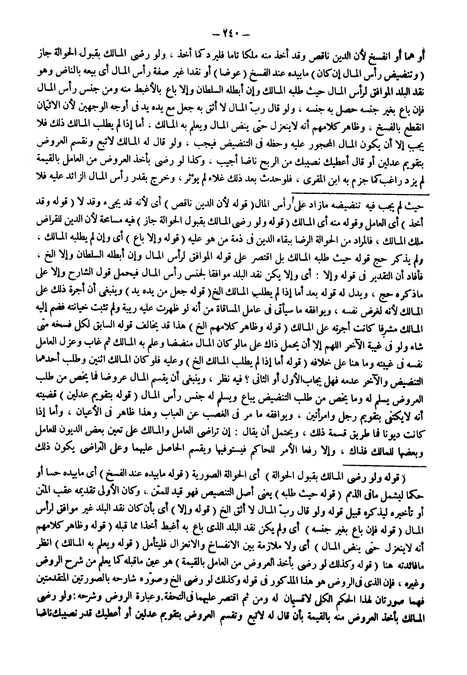 أَوْ هُمَا أَوْ انْفَسَخَ لِأَنَّ الدَّيْنَ نَاقِصٌ وَقَدْ أَخَذَ مِنْهُ مِلْكًا تَامًّا فَلْيَرُدَّ كَمَا أَخَذَ، وَلَوْ رَضِيَ الْمَالِكُ بِقَبُولِ الْحَوَالَةِ جَازَ (وَتَنْضِيضُ رَأْسِ الْمَالِ) (إنْ كَانَ) مَا بِيَدِهِ عِنْدَ الْفَسْخِ (عِوَضًا) أَوْ نَقْدًا غَيْرَ صِفَةِ رَأْسِ الْمَالِ أَيْ بَيْعُهُ بِالنَّاضِّ وَهُوَ نَقْدُ الْبَلَدِ الْمُوَافِقِ لِرَأْسِ الْمَالِ حَيْثُ طَلَبَهُ الْمَالِكُ وَإِنْ أَبْطَلَهُ السُّلْطَانُ وَإِلَّا بَاعَ بِالْأَغْبَطِ مِنْهُ وَمِنْ جِنْسِ رَأْسِ الْمَالِ فَإِنْ بَاعَ بِغَيْرِ جِنْسِهِ حَصَلَ بِهِ جِنْسُهُ، وَلَوْ قَالَ رَبُّ الْمَالِ لَا أَثِقُ بِهِ جُعِلَ مَعَ يَدِهِ يَدٌ فِي أَوْجَهِ الْوَجْهَيْنِ لِأَنَّ الِائْتِمَانَ انْقَطَعَ بِالْفَسْخِ، وَظَاهِرُ كَلَامِهِمْ أَنَّهُ لَا يَنْعَزِلُ حَتَّى يَنِضَّ الْمَالَ وَيَعْلَمَ بِهِ الْمَالِكُ، أَمَّا إذَا لَمْ يَطْلُبْ الْمَالِكُ ذَلِكَ فَلَا يَجِبُ إلَّا أَنْ يَكُونَ الْمَالُ الْمَحْجُورُ عَلَيْهِ وَحَظُّهُ فِي التَّنْضِيضِ فَيَجِبُ، وَلَوْ قَالَ لَهُ الْمَالِكُ لَا تَبِعْ وَنَقْسِمُ الْعُرُوضَ بِتَقْوِيمِ عَدْلَيْنِ أَوْ قَالَ أُعْطِيك نَصِيبَك مِنْ الرِّبْحِ نَاضًّا أُجِيبُ. وَكَذَا لَوْ رَضِيَ بِأَخْذِ الْعُرُوضِ مِنْ الْعَامِلِ بِالْقِيمَةِ لَمْ يَزِدْ رَاغِبٌ كَمَا جَزَمَ بِهِ ابْنُ الْمُقْرِي. فَلَوْ حَدَثَ بَعْدَ ذَلِكَ غَلَاءٌ لَمْ يُؤَثِّرْ، وَخَرَجَ بِقَدْرِ رَأْسِ الْمَالِ الزَّائِدِ عَلَيْهِ فَلَا