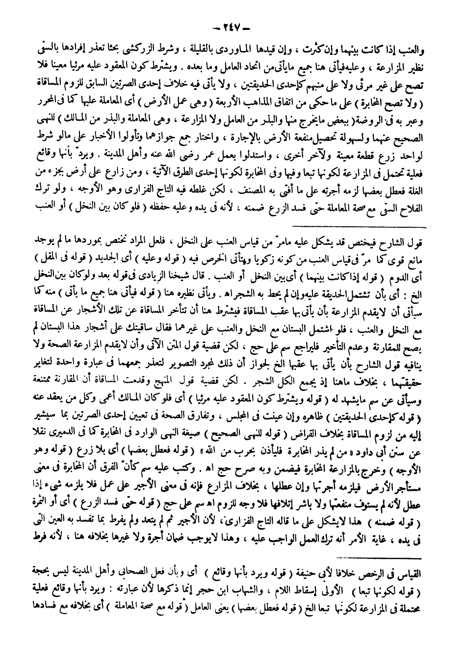 ـــــــــــــــــــــــــــــSقَوْلَ الشَّارِحِ فَيَخْتَصُّ قَدْ يَشْكُلُ عَلَيْهِ مَا مَرَّ مِنْ قِيَاسِ الْعِنَبِ عَلَى النَّخْلِ، فَلَعَلَّ الْمُرَادَ تَخْتَصُّ بِمَوْرِدِهَا مَا لَمْ يُوجَدْ مَانِعٌ قَوِيٌّ كَمَا مَرَّ فِي قِيَاسِ الْعِنَبِ مِنْ كَوْنِهِ زَكَوِيًّا وَيَتَأَتَّى الْخَرْصُ فِيهِ (قَوْلُهُ: وَعَلَيْهِ) أَيْ الْجَدِيدُ (قَوْلُهُ: فِي الْمُقِلِّ) أَيْ الدَّوْمُ (قَوْلُهُ: إذَا كَانَتْ بَيْنَهُمَا) أَيْ بَيْنَ النَّخْلِ أَوْ الْعِنَبِ. قَالَ شَيْخُنَا الزِّيَادِيُّ فِي قَوْلِهِ بَعْدُ: وَلَوْ كَانَ بَيْنَ النَّخْلِ إلَخْ: أَيْ بِأَنْ تَشْتَمِلَ الْحَدِيقَةُ عَلَيْهِ وَإِنْ لَمْ يُحِطْ بِهِ الشَّجَرُ اهـ. وَيَأْتِي نَظِيرُهُ هُنَا (قَوْلُهُ: فَيَأْتِي هُنَا جَمِيعُ مَا يَأْتِي) مِنْهُ كَمَا سَيَأْتِي أَنْ لَا يُقَدِّمَ الْمُزَارَعَةَ بِأَنْ يَأْتِيَ بِهَا عَقِبَ الْمُسَاقَاةِ فَيَشْتَرِطُ هُنَا أَنْ تَتَأَخَّرَ الْمُسَاقَاةُ عَنْ تِلْكَ الْأَشْجَارِ عَنْ الْمُسَاقَاةِ مَعَ النَّخْلِ وَالْعِنَبِ، فَلَوْ اشْتَمَلَ الْبُسْتَانُ مَعَ النَّخْلِ وَالْعِنَبِ عَلَى غَيْرِهِمَا فَقَالَ سَاقَيْتُك عَلَى أَشْجَارِ هَذَا الْبُسْتَانِ لَمْ يَصِحَّ لِلْمُقَارَنَةِ وَعَدَمِ التَّأْخِيرِ فَلْيُرَاجَعْ سم عَلَى حَجّ، لَكِنَّ قَضِيَّةَ قَوْلِ الْمَتْنِ الْآتِي وَأَنْ لَا يُقَدِّمَ الْمُزَارَعَةَ الصِّحَّةُ وَلَا يُنَافِيهِ قَوْلُ الشَّارِحِ بِأَنْ يَأْتِيَ بِهَا عَقِبَهَا إلَخْ لِجَوَازِ أَنَّ ذَلِكَ لِمُجَرَّدِ التَّصْوِيرِ لِتَعَذُّرِ جَمْعِهِمَا فِي عِبَارَةٍ وَاحِدَةٍ لِتَغَايُرِ حَقِيقَتِهِمَا، بِخِلَافِ مَا هُنَا إذْ يَجْمَعُ الْكُلُّ الشَّجَرَ. لَكِنَّ قَضِيَّةَ قَوْلِ الْمَنْهَجِ وَقُدِّمَتْ الْمُسَاقَاةُ أَنَّ الْمُقَارَنَةَ مُمْتَنِعَةٌ وَسَيَأْتِي عَنْ سم مَا يَشْهَدُ لَهُ.