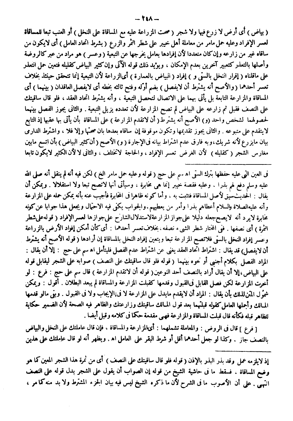 (قَوْلُهُ وَعَلَيْهِ حَمْلُ مَا مَرَّ إلَخْ) لَكِنَّ فِيهِ أَنَّهُ لَمْ يَنْقُلْ أَنَّهُ - صَلَّى اللَّهُ عَلَيْهِ وَسَلَّمَ - دَفَعَ لَهُمْ بَذْرًا. وَعَلَيْهِ فَقِصَّةُ خَيْبَرَ إنَّمَا هِيَ مُخَابَرَةٌ، وَسَيَأْتِي أَنَّهَا لَا تَصِحُّ تَبَعًا وَلَا اسْتِقْلَالًا. وَيُمْكِنُ أَنْ يُقَالَ: الْحَدِيثُ سِيقَ لِأَصْلِ الْمُسَاقَاةِ فَتَثْبُتُ بِهِ. وَأَمَّا كَوْنُهُ ظَاهِرًا فِي الْمُخَابَرَةِ فَأُجِيبُ عَنْهُ بِأَنَّهُ يُمْكِنُ حَمْلُهُ عَلَى الْمُزَارَعَةِ وَأَنَّهُ - عَلَيْهِ الصَّلَاةُ وَالسَّلَامُ - أَعْطَاهُمْ بَذْرًا وَأَمَرَ مَنْ يُعْطِيهِمْ. وَالْجَوَابُ يَكْفِي فِيهِ الِاحْتِمَالُ وَيُجْعَلُ هَذَا جَوَابًا عَنْ كَوْنِهِ مُخَابَرَةً لَا يَرُدُّ أَنَّهُ لَا يَصِحُّ جَعْلُهُ دَلِيلًا عَلَى جَوَازِ الْمُزَارَعَةِ لِاسْتِدْلَالِ الشَّارِحِ عَلَى جَوَازِهَا لِعُسْرِ الْإِفْرَادِ (قَوْلُهُ: عَلَى شَطْرِ الثَّمَرَةِ) أَيْ نِصْفِهَا. فَفِي الْمُخْتَارِ شَطْرُ الشَّيْءِ نِصْفُهُ. بِخِلَافِ تَعَسُّرِ أَحَدِهِمَا: أَيْ كَأَنْ أَمْكَنَ إفْرَادُ الْأَرْضِ بِالزِّرَاعَةِ وَعَسُرَ إفْرَادُ النَّخْلِ بِالسَّقْيِ فَلَا تَصِحُّ الْمُزَارَعَةُ تَبَعًا وَيَتَعَيَّنُ إفْرَادُ النَّخْلِ بِالْمُسَاقَاةِ إنْ أَرَادَهَا.