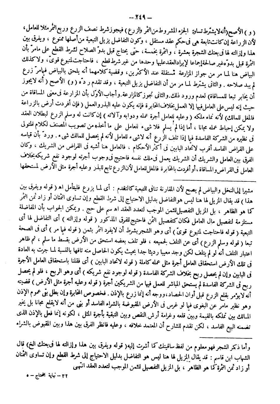 (وَ) الْأَصَحُّ (أَنَّهُ لَا يُشْتَرَطُ) (تَسَاوِي الْجُزْءِ الْمَشْرُوطِ مِنْ الثَّمَرِ وَالزَّرْعِ) فَيَجُوزُ شَرْطُ نِصْفِ الزَّرْعِ وَرُبُعِ الثَّمَر مَثَلًا لِلْعَامِلِ، لِأَنَّ الزِّرَاعَةَ إنْ كَانَتْ تَابِعَةً هِيَ فِي حُكْمِ عَقْدٍ مُسْتَقِلٍّ، وَكَوْنُ التَّفَاصُلِ يُزِيلُ التَّبَعِيَّةَ مِنْ أَصْلِهَا مَمْنُوعٌ، وَيُفَرَّقُ بَيْنَ هَذَا وَإِزَالَتِهِ لَهَا فِي بِعْتُك الشَّجَرَةَ بِعَشَرَةٍ، وَالثَّمَرَةَ بِخَمْسَةٍ، حَتَّى يَحْتَاجَ قَبْلَ بُدُوِّ الصَّلَاحِ لِشَرْطِ الْقَطْعِ عَلَى مَا مَرَّ بِأَنَّ الثَّمَرَةَ قَبْلَ بُدُوِّهِ غَيْرُ صَالِحَةٍ إجْمَاعًا لِإِيرَادِ الْعَقْدِ عَلَيْهَا وَحْدَهَا مِنْ غَيْرِ شَرْطِ قَطْعٍ، فَاحْتَاجَتْ لِمَتْبُوعٍ قَوِيٍّ، وَلَا كَذَلِكَ الْبَيَاضُ هُنَا لِمَا مَرَّ مِنْ جَوَازِ الْمُزَارَعَةِ مُسْتَقِلَّةً عِنْدَ الْأَكْثَرِينَ، وَقَضِيَّةُ كَلَامِهِمَا أَنْ يَلْحَقَ بِالْبَيَاضِ فِيمَا مَرَّ زَرْعٌ لَمْ يَبْدُ صَلَاحُهُ. وَالثَّانِي يُشْتَرَطُ لِمَا مَرَّ مِنْ أَنَّ التَّفَاضُلَ يُزِيلُ التَّبَعِيَّةَ، وَقَدْ تَقَدَّمَ رَدُّهُ.