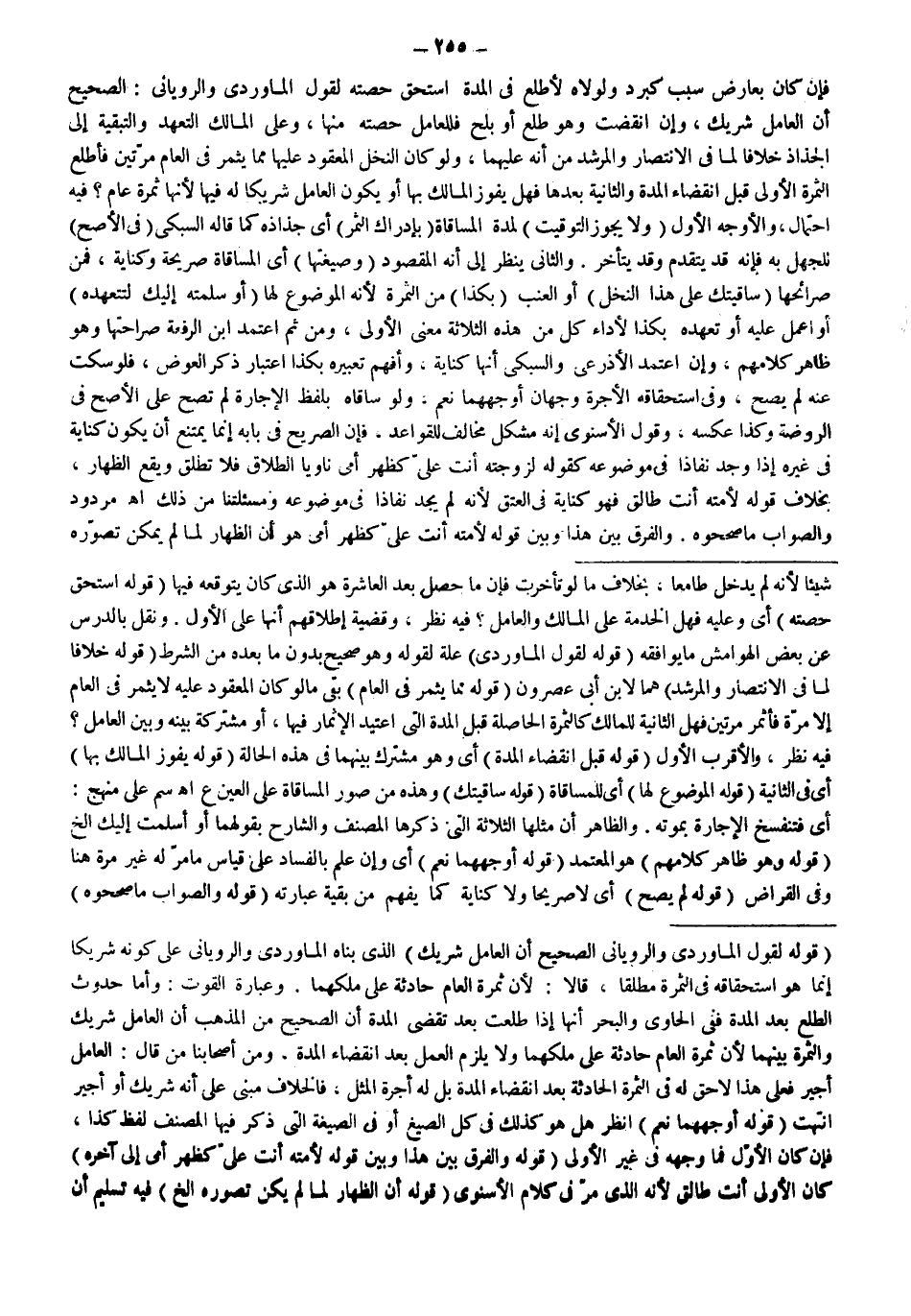 ـــــــــــــــــــــــــــــSشَيْئًا لِأَنَّهُ لَمْ يَدْخُلْ طَامِعًا، بِخِلَافِ مَا لَوْ تَأَخَّرَتْ فَإِنَّ مَا حَصَلَ بَعْدَ الْعَاشِرَةِ هُوَ الَّذِي كَانَ يَتَوَقَّعُهُ فِيهَا (قَوْلُهُ اسْتَحَقَّ حِصَّتَهُ) أَيْ وَعَلَيْهِ فَهَلْ الْخِدْمَةُ عَلَى الْمَالِكِ وَالْعَامِلِ؟ فِيهِ نَظَرٌ، وَقَضِيَّةُ إطْلَاقِهِمْ أَنَّهَا عَلَى الْأَوَّلِ. وَنُقِلَ بِالدَّرْسِ عَنْ بَعْضِ الْهَوَامِشِ مَا يُوَافِقُهُ (قَوْلُهُ: لِقَوْلِ الْمَاوَرْدِيِّ) عِلَّةٌ لِقَوْلِهِ وَهُوَ صَحِيحٌ بِدُونِ مَا بَعْدَهُ مِنْ الشَّرْطِ (قَوْلُهُ خِلَافًا لِمَا فِي الِانْتِصَارِ وَالْمُرْشِدِ) هُمَا لِابْنِ أَبِي عَصْرُونٍ (قَوْلُهُ: مِمَّا يُثْمِرُ فِي الْعَامِ) بَقِيَ مَا لَوْ كَانَ الْمَعْقُودُ عَلَيْهِ لَا يُثْمِرُ فِي الْعَامِ إلَّا مَرَّةً فَأَثْمَرَ مَرَّتَيْنِ فَهَلْ الثَّانِيَةُ لِلْمَالِكِ كَالثَّمَرَةِ الْحَاصِلَةِ قَبْلَ الْمُدَّةِ الَّتِي اُعْتِيدَ الْإِثْمَارُ فِيهَا، أَوْ مُشْتَرَكَةٌ بَيْنَهُ وَبَيْنَ الْعَامِلِ؟ فِيهِ نَظَرٌ، وَالْأَقْرَبُ الْأَوَّلُ (قَوْلُهُ: قَبْلَ انْقِضَاءِ الْمُدَّةِ) أَيْ وَهُوَ مُشْتَرَكٌ بَيْنَهُمَا فِي هَذِهِ الْحَالَةِ (قَوْلُهُ: يَفُوزُ الْمَالِكُ بِهَا) أَيْ فِي الثَّانِيَةِ