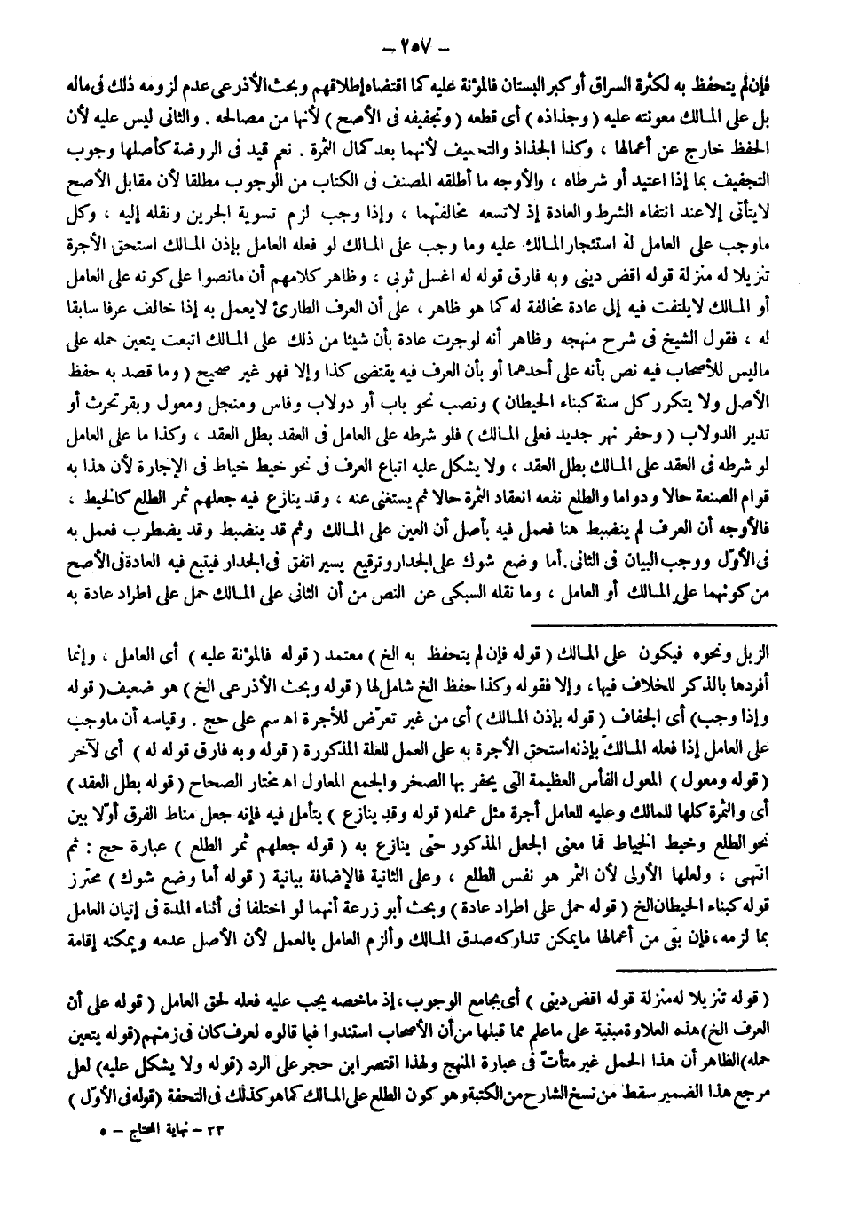 ـــــــــــــــــــــــــــــSالزِّبْلِ وَنَحْوِهِ فَيَكُونُ عَلَى الْمَالِكِ (قَوْلُهُ: فَإِنْ لَمْ يَتَحَفَّظْ بِهِ إلَخْ) مُعْتَمَدٌ (قَوْلُهُ: فَالْمُؤْنَةُ عَلَيْهِ) أَيْ الْعَامِلِ، وَإِنَّمَا أَفْرَدَهَا بِالذِّكْرِ لِلْخِلَافِ فِيهَا، وَإِلَّا فَقَوْلُهُ وَكَذَا حُفِظَ إلَخْ شَامِلٌ لَهَا (قَوْلُهُ: وَبَحْثُ الْأَذْرَعِيِّ إلَخْ) هُوَ ضَعِيفٌ (قَوْلُهُ: وَإِذَا وَجَبَ) أَيْ الْجَفَافُ (قَوْلُهُ: بِإِذْنِ الْمَالِكِ) أَيْ مِنْ غَيْرِ تَعَرُّضٍ لِلْأُجْرَةِ اهـ سم عَلَى حَجّ. وَقِيَاسُهُ أَنَّ مَا وَجَبَ عَلَى الْعَامِلِ إذَا فَعَلَهُ الْمَالِكُ بِإِذْنِهِ اسْتَحَقَّ الْأُجْرَةَ بِهِ عَلَى الْعَمَلِ لِلْعِلَّةِ الْمَذْكُورَةِ (قَوْلُهُ: وَبِهِ فَارَقَ قَوْلُهُ لَهُ) أَيْ لِآخَرَ (قَوْلُهُ: وَمِعْوَلُ) الْمِعْوَلُ الْفَأْسُ الْعَظِيمَةُ الَّتِي يُحْفَرُ بِهَا الصَّخْرُ وَالْجَمْعُ الْمَعَاوِلُ اهـ مُخْتَارُ الصِّحَاحِ (قَوْلُهُ: بَطَلَ الْعَقْدُ) أَيْ وَالثَّمَرَةُ كُلُّهَا لِلْمَالِكِ وَعَلَيْهِ لِلْعَامِلِ أُجْرَةُ مِثْلِ عَمَلِهِ (قَوْلُهُ: وَقَدْ يُنَازِعُ) يُتَأَمَّلُ فِيهِ فَإِنَّهُ جَعَلَهُ مَنَاطَ الْفَرْقِ أَوَّلًا بَيْنَ نَحْوِ الطَّلْعِ وَخَيْطِ الْخَيَّاطِ فَمَا مَعْنَى الْجَعْلِ الْمَذْكُورِ حَتَّى يُنَازِعَ بِهِ (قَوْلُهُ: جَعَلَهُمْ ثَمَرَ الطَّلْعِ) عِبَارَةُ حَجّ: ثُمَّ انْتَهَى، وَلَعَلَّهَا الْأَوْلَى لِأَنَّ الثَّمَرَ هُوَ نَفْسُ الطَّلْعِ، وَعَلَى الثَّانِيَةِ فَالْإِضَافَةُ بَيَانِيَّةٌ (قَوْلُهُ: أَمَّا وَضْعُ شَوْكٍ) مُحْتَرَزُ قَوْلِهِ كَبِنَاءِ الْحِيطَانِ إلَخْ (قَوْلُهُ: حُمِلَ عَلَى اطِّرَادِ عَادَةٍ) وَبَحَثَ أَبُو زُرْعَةَ أَنَّهُمَا لَوْ اخْتَلَفَا فِي أَثْنَاءِ الْمُدَّةِ فِي إتْيَانِ الْعَامِلِ بِمَا لَزِمَهُ، فَإِنْ بَقِيَ مِنْ أَعْمَالِهَا مَا يُمْكِنُ تَدَارُكُهُ صَدَقَ الْمَالِكُ وَأَلْزَمَ الْعَامِلَ بِالْعَمَلِ لِأَنَّ الْأَصْلَ عَدَمُهُ وَيُمْكِنُهُ إقَامَةُ