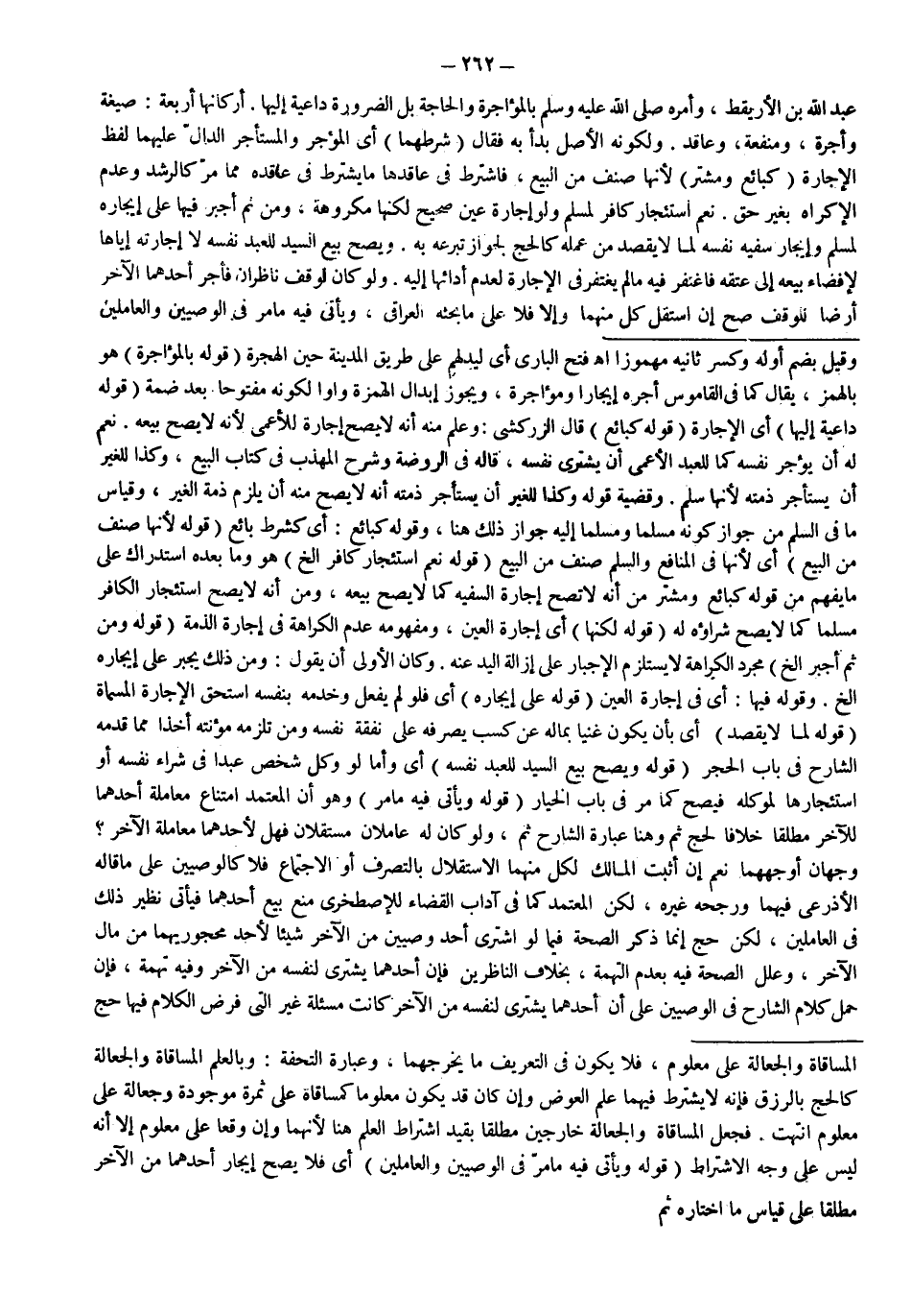(قَوْلُهُ: كَبَائِعٍ) قَالَ الزَّرْكَشِيُّ: وَعُلِمَ مِنْهُ أَنَّهُ لَا يَصِحُّ إجَارَةٌ لِلْأَعْمَى لِأَنَّهُ لَا يَصِحُّ بَيْعُهُ. نَعَمْ لَهُ أَنْ يُؤْجِرَ نَفْسَهُ كَمَا لِلْعَبْدِ الْأَعْمَى أَنْ يَشْتَرِيَ نَفْسَهُ، قَالَهُ فِي الرَّوْضَةِ وَشَرْحِ الْمُهَذِّبِ فِي كِتَابِ الْبَيْعِ، وَكَذَا لِلْغَيْرِ أَنْ يَسْتَأْجِرَ ذِمَّتَهُ لِأَنَّهَا سَلَمٌ. وَقَضِيَّةُ قَوْلِهِ وَكَذَا لِلْغَيْرِ أَنْ يَسْتَأْجِرَ ذِمَّتَهُ أَنَّهُ لَا يَصِحُّ مِنْهُ أَنْ يَلْزَمَ ذِمَّةَ الْغَيْرِ، وَقِيَاسُ مَا فِي السَّلَمِ مِنْ جَوَازِ كَوْنِهِ مُسْلِمًا وَمُسْلَمًا إلَيْهِ جَوَازُ ذَلِكَ هُنَا، وَقَوْلُهُ كَبَائِعٍ: أَيْ كَشَرْطِ بَائِعٍ (قَوْلُهُ: لِأَنَّهَا صِنْفٌ مِنْ الْبَيْعِ) أَيْ لِأَنَّهَا فِي الْمَنَافِعِ، وَالسَّلَمُ صِنْفٌ مِنْ الْبَيْعِ (قَوْلُهُ: نَعَمْ اسْتِئْجَارُ كَافِرٍ إلَخْ) هُوَ وَمَا بَعْدَهُ اسْتِدْرَاكٌ عَلَى مَا يُفْهَمُ مِنْ قَوْلِهِ كَبَائِعٍ وَمُشْتَرٍ مِنْ أَنَّهُ لَا تَصِحُّ إجَارَةُ السَّفِيهِ كَمَا لَا يَصِحُّ بَيْعُهُ، وَمِنْ أَنَّهُ لَا يَصِحُّ اسْتِئْجَارُ الْكَافِرِ مُسْلِمًا كَمَا لَا يَصِحُّ شِرَاؤُهُ لَهُ (قَوْلُهُ: لَكِنَّهَا) أَيْ إجَارَةُ الْعَيْنِ، وَمَفْهُومُهُ عَدَمُ الْكَرَاهَةِ فِي إجَارَةِ الذِّمَّةِ (قَوْلُهُ: وَمِنْ ثَمَّ أُجْبِرَ إلَخْ) مُجَرَّدُ الْكَرَاهَةِ لَا يَسْتَلْزِمُ الْإِجْبَارَ عَلَى إزَالَةِ الْيَدِ عَنْهُ. وَكَانَ الْأَوْلَى أَنْ يَقُولَ: وَمِنْ ذَلِكَ يُجْبَرُ عَلَى إيجَارِهِ إلَخْ. وَقَوْلُهُ فِيهَا: أَيْ فِي إجَارَةِ الْعَيْنِ (قَوْلُهُ: عَلَى إيجَارِهِ) أَيْ فَلَوْ لَمْ يَفْعَلْ وَخَدَمَهُ بِنَفْسِهِ اسْتَحَقَّ الْإِجَارَةَ الْمُسَمَّاةَ (قَوْلُهُ: لِمَا لَا يَقْصِدُ) أَيْ بِأَنْ يَكُونَ غَنِيًّا بِمَالِهِ عَنْ كَسْبٍ يَصْرِفُهُ عَلَى نَفَقَةِ نَفْسِهِ وَمَنْ تَلْزَمُهُ مُؤْنَتُهُ أَخْذًا مِمَّا قَدَّمَهُ الشَّارِحُ فِي بَابِ الْحَجْرِ (قَوْلُهُ: وَيَصِحُّ بَيْعُ السَّيِّدِ لِلْعَبْدِ نَفْسَهُ) أَيْ وَأَمَّا لَوْ وَكَّلَ شَخْصٌ عَبْدًا فِي شِرَاءِ نَفْسِهِ أَوْ اسْتِئْجَارِهَا لِمُوَكِّلِهِ فَيَصِحُّ كَمَا مَرَّ فِي بَابِ الْخِيَارِ (قَوْلُهُ: وَيَأْتِي فِيهِ مَا مَرَّ) وَهُوَ أَنَّ الْمُعْتَمَدَ امْتِنَاعُ مُعَامَلَةِ أَحَدِهِمَا لِلْآخَرِ مُطْلَقًا خِلَافًا لحج ثَمَّ وَهُنَا عِبَارَةُ الشَّارِحِ ثُمَّ، وَلَوْ كَانَ لَهُ عَامِلَانِ مُسْتَقِلَّانِ فَهَلْ لِأَحَدِهِمَا مُعَامَلَةُ الْآخَرِ؟ وَجْهَانِ أَوْجَهُهُمَا نَعَمْ إنْ أَثْبَتَ الْمَالِكُ لِكُلٍّ مِنْهُمَا الِاسْتِقْلَالَ بِالتَّصَرُّفِ أَوْ الِاجْتِمَاعَ فَلَا كَالْوَصِيَّيْنِ عَلَى مَا قَالَهُ الْأَذْرَعِيُّ فِيهِمَا وَرَجَّحَهُ غَيْرُهُ، لَكِنَّ الْمُعْتَمَدَ كَمَا فِي آدَابِ الْقَضَاءِ لِلْإِصْطَخْرِيِّ مَنْعُ بَيْعِ أَحَدِهِمَا فَيَأْتِي نَظِيرُ ذَلِكَ فِي الْعَامِلَيْنِ، لَكِنَّ حَجّ إنَّمَا ذَكَرَ الصِّحَّةَ فِيمَا لَوْ اشْتَرَى أَحَدُ وَصِيَّيْنِ مِنْ الْآخَرِ شَيْئًا لِأَحَدِ مَحْجُورِيهِمَا مِنْ مَالِ الْآخَرِ، وَعَلَّلَ الصِّحَّةَ فِيهِ بِعَدَمِ التُّهْمَةِ، بِخِلَافِ النَّاظِرَيْنِ فَإِنَّ أَحَدَهُمَا يَشْتَرِي لِنَفْسِهِ مِنْ الْآخَرِ وَفِيهِ تُهْمَةٌ، فَإِنْ حُمِلَ كَلَامُ الشَّارِحِ فِي الْوَصِيَّيْنِ عَلَى أَنَّ أَحَدَهُمَا يَشْتَرِي لِنَفْسِهِ مِنْ الْآخَرِ كَانَتْ مَسْأَلَةً غَيْرَ الَّتِي فُرِضَ الْكَلَامُ فِيهَا حَجّ.