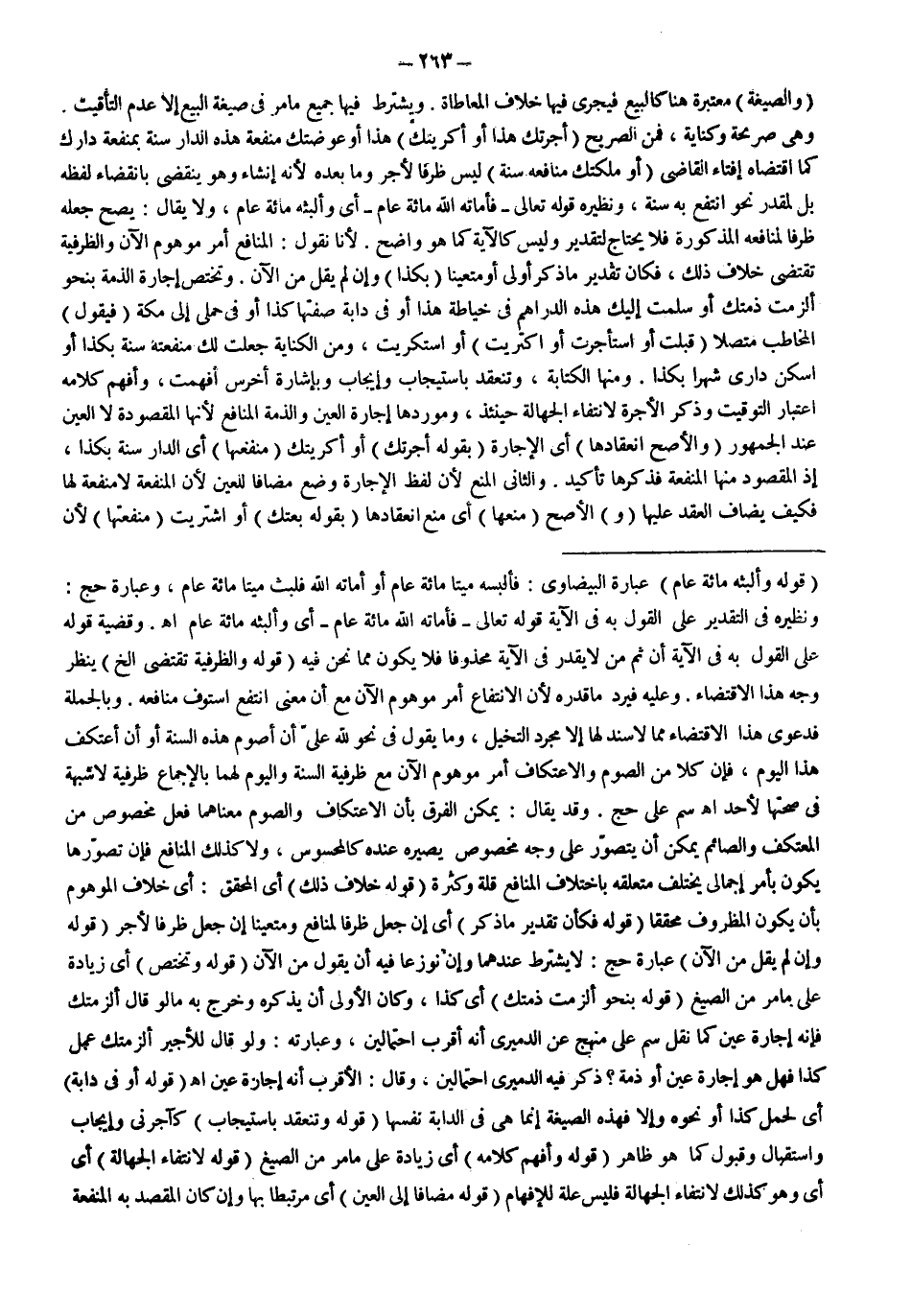 ـــــــــــــــــــــــــــــSقَوْلُهُ: وَأَلْبَثَهُ مِائَةَ عَامٍ) عِبَارَةُ الْبَيْضَاوِيِّ: فَأَلْبَثَهُ مَيْتًا مِائَةَ عَامٍ أَوْ أَمَاتَهُ اللَّهُ فَلَبِثَ مَيْتًا مِائَةَ عَامٍ، وَعِبَارَةُ حَجّ: وَنَظِيرُهُ فِي التَّقْدِيرِ عَلَى الْقَوْلِ بِهِ فِي الْآيَةِ قَوْله تَعَالَى {فَأَمَاتَهُ اللَّهُ مِائَةَ عَامٍ} [البقرة: 259] أَيْ وَأَلْبَثَهُ مِائَةَ عَامٍ اهـ. وَقَضِيَّةُ قَوْلِهِ عَلَى الْقَوْلِ بِهِ فِي الْآيَةِ أَنَّ ثَمَّ مَنْ لَا يُقَدِّرُ فِي الْآيَةِ مَحْذُوفًا فَلَا يَكُونُ مِمَّا نَحْنُ فِيهِ (قَوْلُهُ: وَالظَّرْفِيَّةُ تَقْتَضِي إلَخْ) يُنْظَرُ وَجْهُ هَذَا الِاقْتِضَاءِ. وَعَلَيْهِ فَيُرَدُّ مَا قَدَّرَهُ لِأَنَّ الِانْتِفَاعَ أَمْرٌ مَوْهُومٌ الْآنَ مَعَ أَنَّ مَعْنَى انْتَفِعْ اسْتَوْفِ مَنَافِعَهُ. وَبِالْجُمْلَةِ فَدَعْوَى هَذَا الِاقْتِضَاءِ مِمَّا لَا سَنَدَ لَهَا إلَّا مُجَرَّدَ التَّخَيُّلِ، وَمَا يَقُولُ فِي نَحْوِ لِلَّهِ عَلَيَّ أَنْ أَصُومَ هَذِهِ السَّنَةَ أَوْ أَنْ أَعْتَكِفَ هَذَا الْيَوْمَ، فَإِنَّ كُلًّا مِنْ الصَّوْمِ وَالِاعْتِكَافِ أَمْرٌ مَوْهُومٌ الْآنَ مَعَ ظَرْفِيَّةِ السَّنَةِ وَالْيَوْمِ لَهُمَا بِالْإِجْمَاعِ ظَرْفِيَّةٍ لَا شُبْهَةَ فِي صِحَّتِهَا لِأَحَدٍ اهـ سم عَلَى حَجّ. وَقَدْ يُقَالُ: يُمْكِنُ الْفَرْقُ بِأَنَّ الِاعْتِكَافَ وَالصَّوْمَ مَعْنَاهُمَا فِعْلٌ مَخْصُوصٌ مِنْ الْمُعْتَكِفِ وَالصَّائِمِ يُمْكِنُ أَنْ يُتَصَوَّرَ عَلَى وَجْهٍ مَخْصُوصٍ يُصَيِّرُهُ عِنْدَهُ كَالْمَحْسُوسِ، وَلَا كَذَلِكَ الْمَنَافِعُ فَإِنَّ تَصَوُّرَهَا يَكُونُ بِأَمْرٍ إجْمَالِيٍّ يَخْتَلِفُ مُتَعَلَّقُهُ بِاخْتِلَافِ الْمَنَافِعِ قِلَّةً وَكَثْرَةً (قَوْلُهُ: خِلَافَ ذَلِكَ) أَيْ الْمُحَقَّقِ: أَيْ خِلَافَ الْمَوْهُومِ بِأَنْ يَكُونَ الْمَظْرُوفُ مُحَقَّقًا (قَوْلُهُ: فَكَانَ تَقْدِيرُ مَا ذُكِرَ) أَيْ إنْ جُعِلَ ظَرْفًا لِمَنَافِعَ وَمُتَعَيِّنًا إنْ جُعِلَ ظَرْفًا لِأَجْرٍ (قَوْلُهُ وَإِنْ لَمْ يَقُلْ مِنْ الْآنَ) عِبَارَةُ حَجّ: لَا يُشْتَرَطُ عِنْدَهُمَا وَإِنْ نُوزِعَا فِيهِ أَنْ يَقُولَ مِنْ الْآنَ (قَوْلُهُ وَتَخْتَصُّ) أَيْ زِيَادَةً عَلَى مَا مَرَّ مِنْ الصِّيَغِ