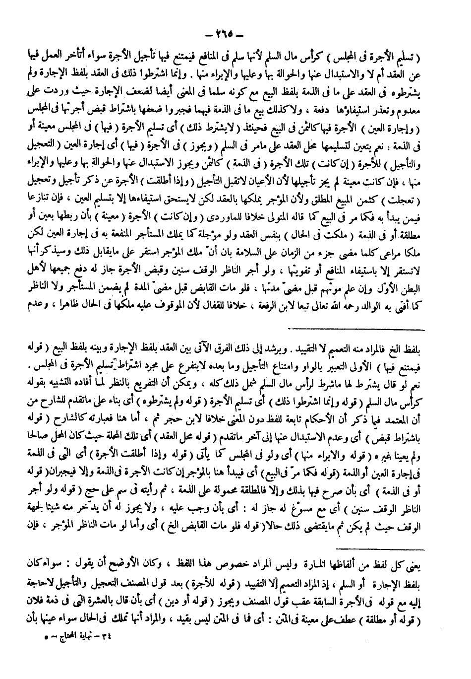 (تَسْلِيمُ الْأُجْرَةِ فِي الْمَجْلِسِ) كَرَأْسِ مَالِ السَّلَمِ لِأَنَّهَا سَلَمٌ فِي الْمَنَافِعِ فَيَمْتَنِعُ فِيهَا تَأْجِيلُ الْأُجْرَةِ سَوَاءٌ أَتَأَخَّرَ الْعَمَلُ فِيهَا عَنْ الْعَقْدِ أَمْ لَا وَالِاسْتِبْدَالُ عَنْهَا وَالْحَوَالَةُ بِهَا وَعَلَيْهَا وَالْإِبْرَاءُ مِنْهَا. وَإِنَّمَا اشْتَرَطُوا ذَلِكَ فِي الْعَقْدِ بِلَفْظِ الْإِجَارَةِ وَلَمْ يَشْتَرِطُوهُ فِي الْعَقْدِ عَلَى مَا فِي الذِّمَّةِ بِلَفْظِ الْبَيْعِ مَعَ كَوْنِهِ سَلَمًا فِي الْمَعْنَى أَيْضًا لِضَعْفِ الْإِجَارَةِ حَيْثُ وَرَدَتْ عَلَى مَعْدُومٍ وَتَعَذَّرَ اسْتِيفَاؤُهَا دَفْعَةً، وَلَا كَذَلِكَ بَيْعُ مَا فِي الذِّمَّةِ فِيهِمَا فَجَبَّرُوا ضَعْفَهَا بِاشْتِرَاطِ قَبْضِ أُجْرَتِهَا فِي الْمَجْلِسِ (وَإِجَارَةُ الْعَيْنِ) الْأُجْرَةُ فِيهَا كَالثَّمَنِ فِي الْبَيْعِ فَحِينَئِذٍ (لَا يُشْتَرَطُ ذَلِكَ) أَيْ تَسْلِيمُ الْأُجْرَةِ (فِيهَا) فِي الْمَجْلِسِ مُعَيَّنَةً أَوْ فِي الذِّمَّةِ. نَعَمْ يَتَعَيَّنُ لِتَسْلِيمِهَا مَحَلُّ الْعَقْدِ عَلَى مَا مَرَّ فِي السَّلَمِ.