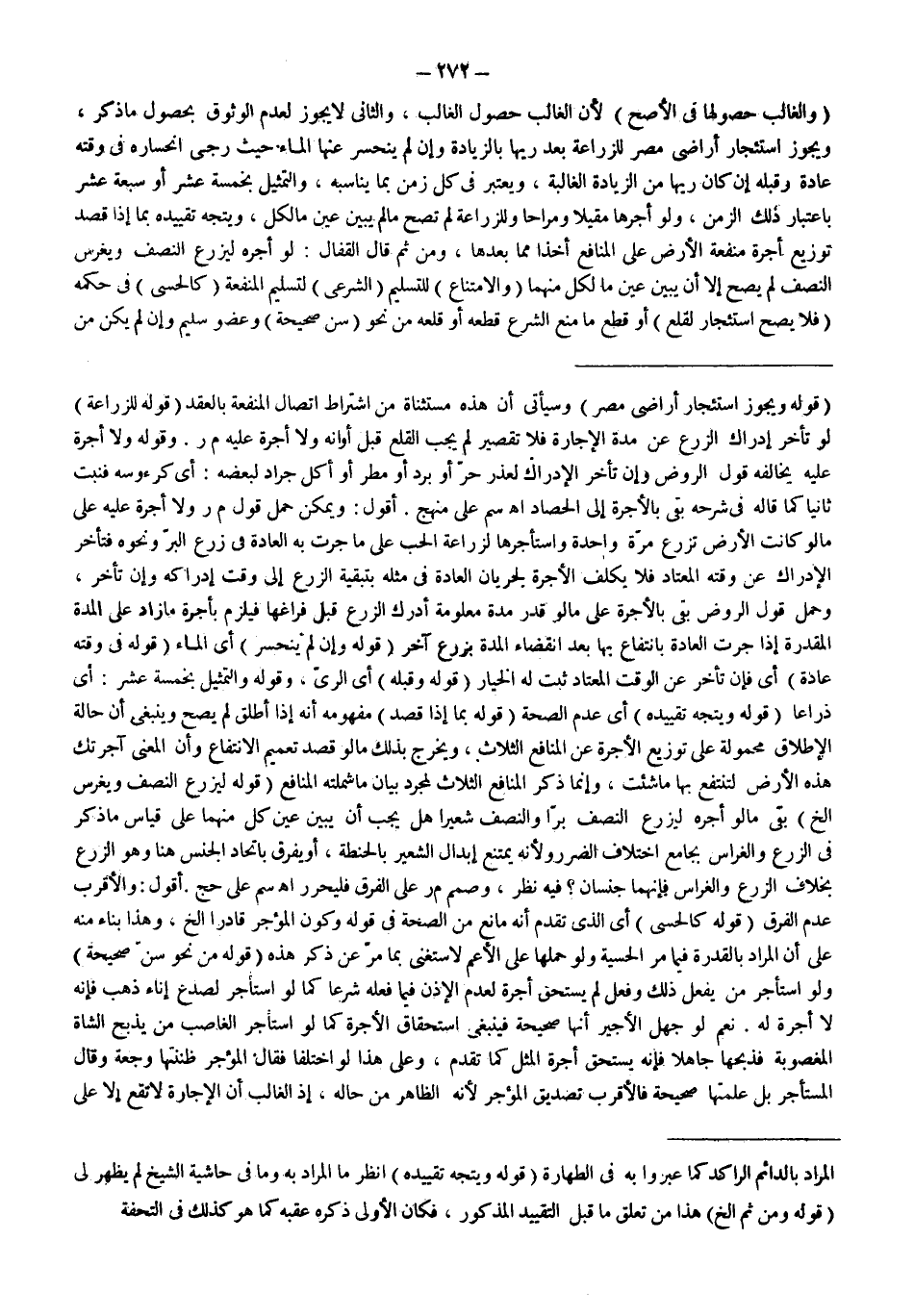 ـــــــــــــــــــــــــــــSقَوْلُهُ: وَيَجُوزُ اسْتِئْجَارُ أَرَاضِيِ مِصْرَ) وَسَيَأْتِي أَنَّ هَذِهِ مُسْتَثْنَاةٌ مِنْ اشْتِرَاطِ اتِّصَالِ الْمَنْفَعَةِ بِالْعَقْدِ (قَوْلُهُ: لِلزِّرَاعَةِ) لَوْ تَأَخَّرَ إدْرَاكُ الزَّرْعِ عَنْ مُدَّةِ الْإِجَارَةِ فَلَا تَقْصِيرَ لَمْ يَجِبْ الْقَلْعُ قَبْلَ أَوَانِهِ وَلَا أُجْرَةَ عَلَيْهِ م ر. وَقَوْلُهُ وَلَا أُجْرَةَ عَلَيْهِ يُخَالِفُهُ قَوْلُ الرَّوْضِ وَإِنْ تَأَخَّرَ الْإِدْرَاكُ لِعُذْرِ حَرٍّ أَوْ بَرْدٍ أَوْ مَطَرٍ أَوْ أَكْلِ جَرَادٍ لِبَعْضِهِ: أَيْ كَرُءُوسِهِ فَنَبَتَ ثَانِيًا كَمَا قَالَهُ فِي شَرْحِهِ بَقِيَ بِالْأُجْرَةِ إلَى الْحَصَادِ اهـ سم عَلَى مَنْهَجٍ. أَقُولُ: وَيُمْكِنُ حَمْلُ قَوْلِ م ر وَلَا أُجْرَةَ عَلَيْهِ عَلَى مَا لَوْ كَانَتْ الْأَرْضُ تُزْرَعُ مَرَّةً وَاحِدَةً وَاسْتَأْجَرَهَا لِزِرَاعَةِ الْحَبِّ عَلَى مَا جَرَتْ بِهِ الْعَادَةُ فِي زَرْعِ الْبُرِّ وَنَحْوِهِ فَتَأَخَّرَ الْإِدْرَاكُ عَنْ وَقْتِهِ الْمُعْتَادِ فَلَا يُكَلَّفُ الْأُجْرَةَ لِجَرَيَانِ الْعَادَةِ فِي مِثْلِهِ بِتَبْقِيَةِ الزَّرْعِ إلَى وَقْتِ إدْرَاكِهِ وَإِنْ تَأَخَّرَ، وَحُمِلَ قَوْلُ الرَّوْضِ بَقِيَ بِالْأُجْرَةِ عَلَى مَا لَوْ قَدَّرَ مُدَّةً مَعْلُومَةً أَدْرَكَ الزَّرْعَ قَبْلَ فَرَاغِهَا فَيَلْزَمُ بِأُجْرَةِ مَا زَادَ عَلَى الْمُدَّةِ الْمُقَدَّرَةِ إذَا جَرَتْ الْعَادَةُ بِانْتِفَاعٍ بِهَا بَعْدَ انْقِضَاءِ الْمُدَّةِ بِزَرْعٍ آخَرَ.