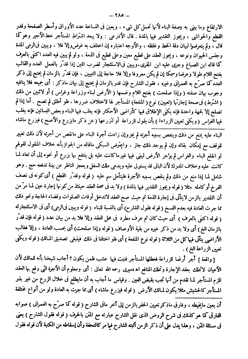 الِارْتِفَاعِ وَمَا يَبْنِي بِهِ وَصِفَةُ الْبِنَاءِ لِأَنَّهَا تَحْمِلُ كُلَّ شَيْءٍ، وَيُعَيِّنُ فِي النِّسَاخَةِ عَدَدَ الْأَوْرَاقِ وَأَسْطُرَ الصَّفْحَةِ وَقَدْرَ الْقَطْعِ وَالْحَوَاشِي، وَيَجُوزُ التَّقْدِيرُ فِيهَا بِالْمُدَّةِ. قَالَ الْأَذْرَعِيُّ: وَلَا يَبْعُدُ اشْتِرَاطُ الْمُسْتَأْجِرِ خَطَّ الْأَجِيرِ وَهُوَ كَمَا قَالَ، وَلَمْ يَتَعَرَّضُوا لِبَيَانِ دِقَّةِ الْخَطِّ وَغِلَظِهِ، وَالْأَوْجَهُ اعْتِبَارُهُ إنْ اخْتَلَفَ بِهِ غَرَضٌ وَإِلَّا فَلَا، وَيُبَيِّنُ فِي الرَّعْيِ الْمُدَّةَ وَجِنْسَ الْحَيَوَانِ وَنَوْعَهُ، وَيَجُوزُ الْعَقْدُ عَلَى قَطِيعٍ مُعَيَّنٍ وَعَلَى قَطِيعٍ فِي الذِّمَّةِ، وَلَوْ لَمْ يُبَيِّنْ فِيهِ الْعَدَدَ اكْتَفَى بِالْعُرْفِ كَمَا قَالَهُ ابْنُ الصَّبَّاغِ وَجَرَى عَلَيْهِ ابْنُ الْمُقْرِي، وَيُبَيِّنُ فِي الِاسْتِئْجَارِ لِضَرْبِ اللَّبَنِ إذَا قُدِّرَ بِالْعَمَلِ الْعَدَدَ وَالْقَالَبَ بِفَتْحِ اللَّامِ طُولًا وَعَرْضًا وَسَمْكًا إنْ لَمْ يَكُنْ مَعْرُوفًا وَإِلَّا فَلَا حَاجَةَ إلَى التَّبْيِينِ، فَإِنْ قُدِّرَ بِالزَّمَانِ لَمْ يَحْتَجْ إلَى ذِكْرِ الْعَدَدِ كَمَا صَرَّحَ بِهِ الْعُمْرَانِيُّ وَغَيْرُهُ، فَقَوْلُ الشَّارِحِ فَإِنْ قُدِّرَ بِالزَّمَانِ لَمْ يَحْتَجْ إلَى بَيَانِ مَا ذُكِرَ: أَيْ جَمِيعُهُ فَلَا يُنَافِيهِ وُجُوبُ بَيَانِ صِفَتِهِ.